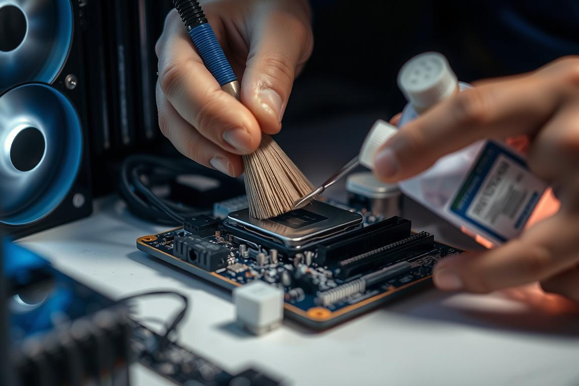 彻底清洁旧硅脂:用异丙醇将无绒布或纸巾浸湿,但不要滴水。轻轻擦拭CPU/GPU核心和散热器底座上的旧硅脂。如果硅脂已经硬化,可先涂抹少量异丙醇静置5分钟,使其软化,再用塑料刮刀辅助清理。对于难以触及的角落,棉签是理想的工具。