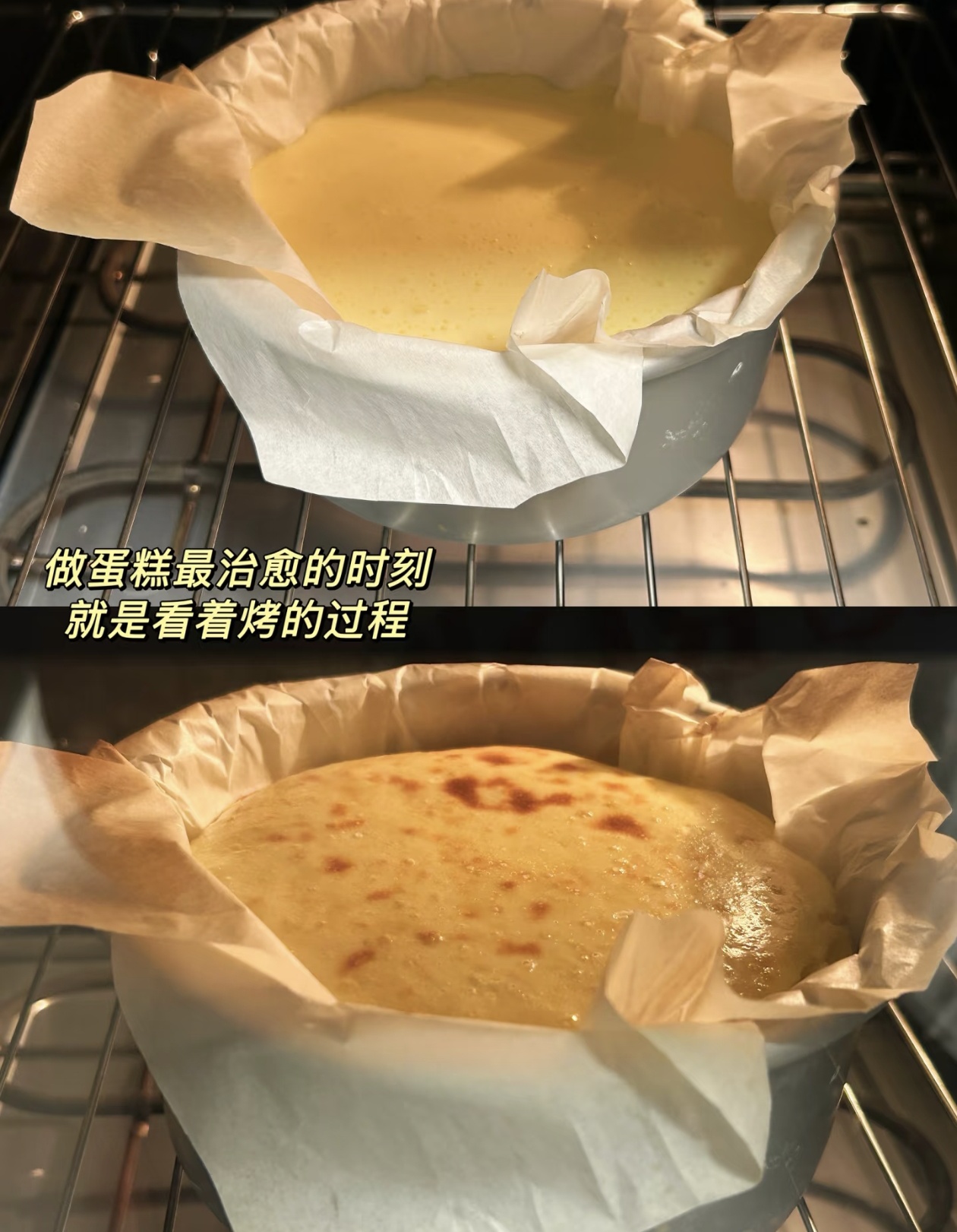 接下来就是烘烤环节了,烤箱提前预热到210℃,预热好后把模具放入烤箱中层,上下火210℃烤25-30分钟,具体时间可以根据自家烤箱的脾气调整,烤到蛋糕表面呈现出深褐色的焦斑,边缘微微鼓起,就可以关火了。这里要注意不用烤太久,巴斯克蛋糕的特点是外焦里嫩,内部有点流心的状态才最好吃,烤太久会变得扎实,失去原本的口感。