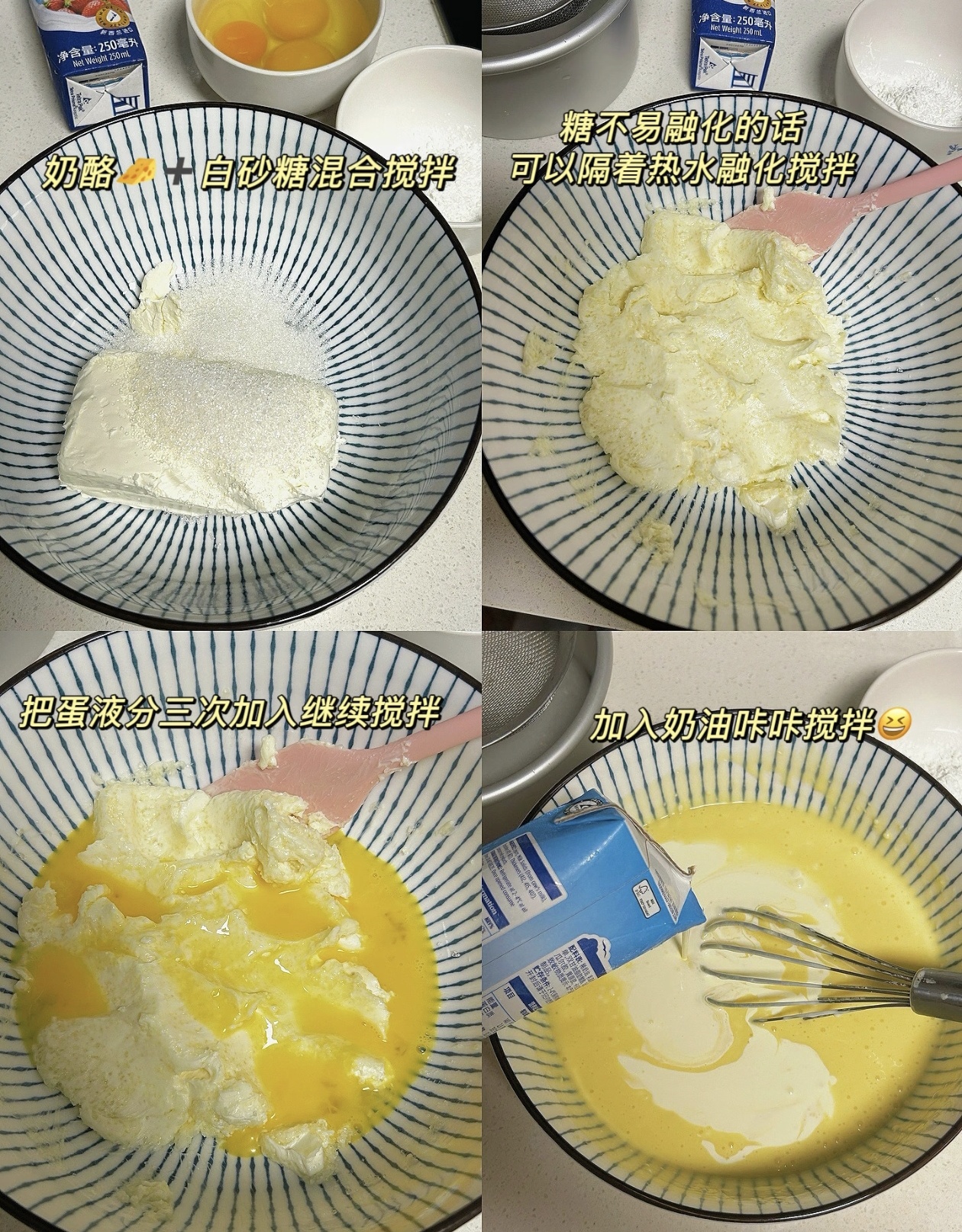 等奶酪软化后,就可以加入细砂糖了,不用一次加太多,分两次加进去更易搅拌均匀,用手动打蛋器顺着一个方向搅,直到糖完全融化,奶酪糊变得细腻没有颗粒。接下来处理鸡蛋,这里要注意是3个全蛋加1个蛋黄,总共4个蛋,蛋黄最好分三次倒入奶酪糊中,第一次倒进去后,用翻拌的方式混合,就像炒菜一样从底部往上翻,避免画圈搅拌导致起筋,混合均匀后再倒第二次,同样翻拌至融合,最后倒第三次,全部加完后可以换成电动打蛋器,低速搅打十几秒,让奶酪糊和蛋液充分融合,变得更加细腻无颗粒。