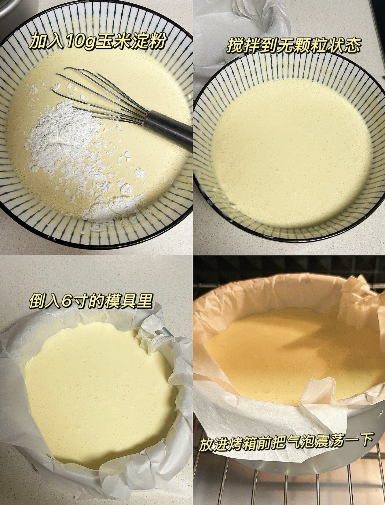 面糊做好后,还有一个关键步骤,就是震荡气泡。准备一个6寸的蛋糕模具,模具底部可以铺一张油纸,方便后续脱模,然后把搅拌好的奶酪糊缓缓倒入模具中,倒完后拿着模具在桌面上轻轻震几下,大概震3-5次,这样可以把面糊里的大气泡震出来,避免烤出来的蛋糕内部有孔洞,影响口感和颜值。
