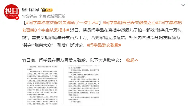 或许是多重危机的倒逼,闫学晶的致歉信展现出前所未有的深刻反思,而非套路化公关。她在文中坦言,事件初期自己满是惊讶与委屈,直到认真研读网友批评,才被“你忘了你的根在哪儿了”这句话戳醒。“大家批评的不是我说错话,而是我怎么变成这样了”,她直白承认,自己出身普通家庭,本是父老乡亲和生活烟火气喂大了艺术生命,却在掌声与鲜花中逐渐迷失,把见世面当成优越感,把“老百姓”当成模糊的词汇,而非值得敬畏的根基,“那份最重要的尊重和敬畏,已经蒙了灰”。