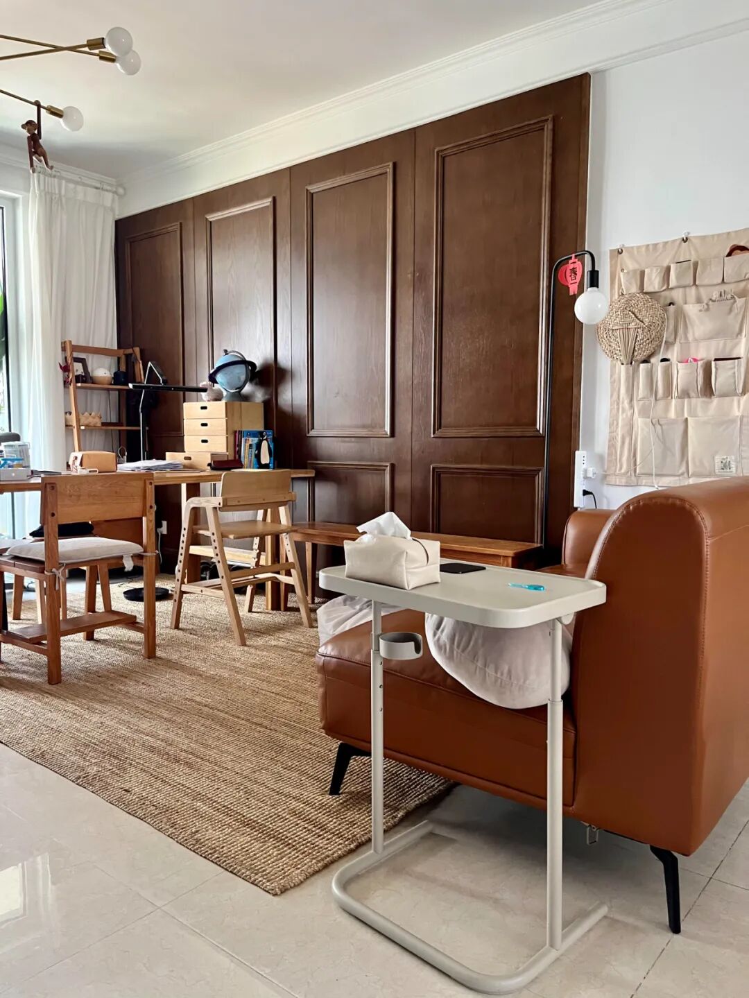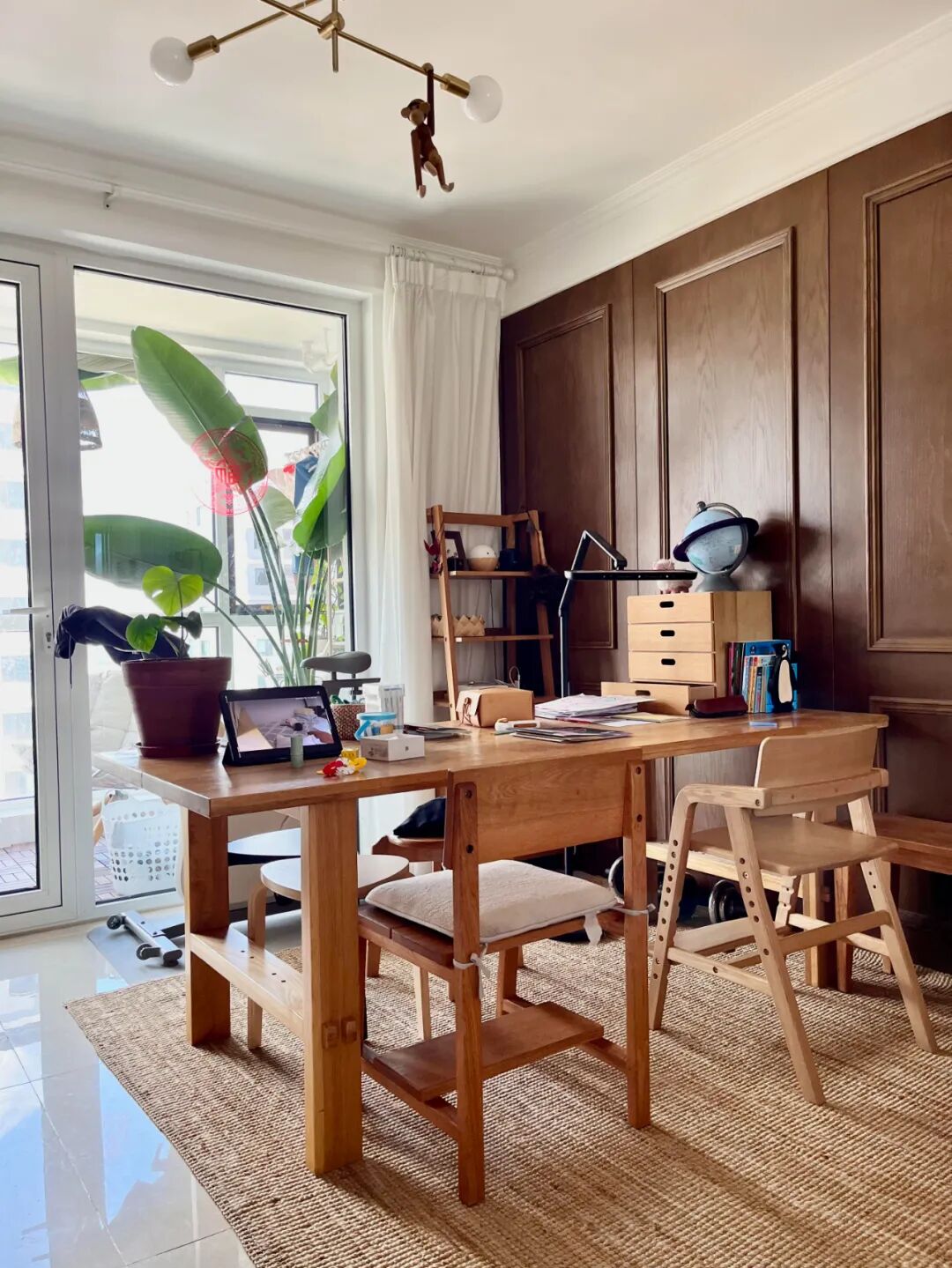 我家小户型,客厅直接摆了一张2米长的大木桌,吃饭、工作、孩子写作业、老婆做手工,全在这儿解决。