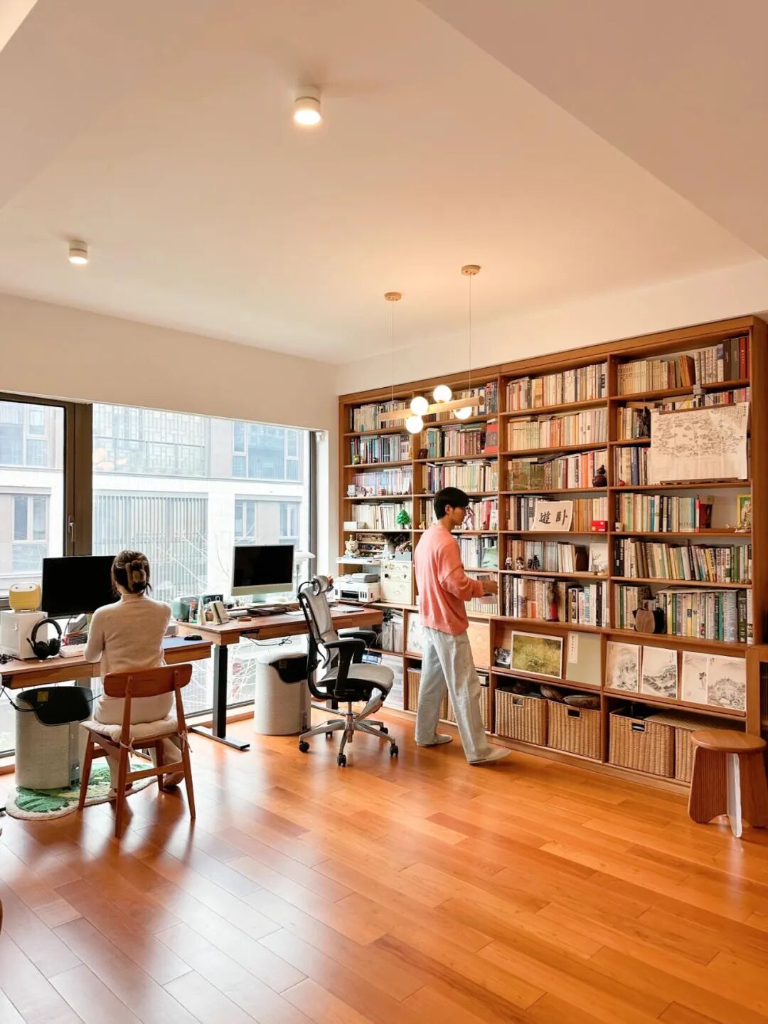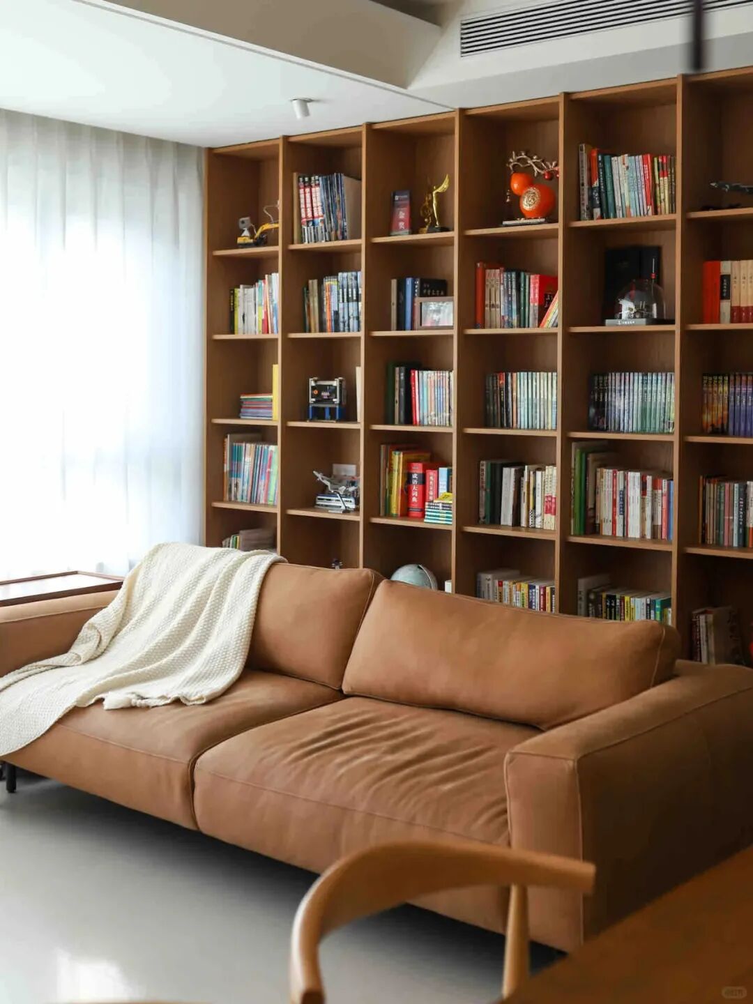 2)想放沙发可以选矮背款的,满墙书柜视觉上偏厚重,如果配高背沙发,空间会显得挤挤巴巴,低矮沙发能让整体更通透。