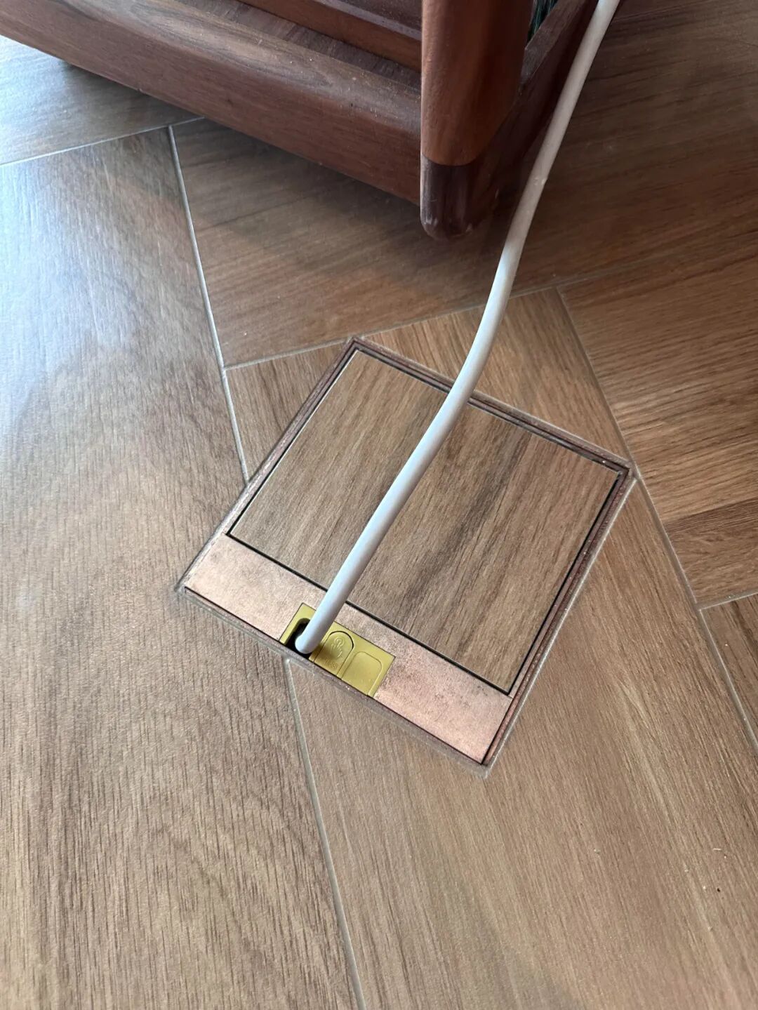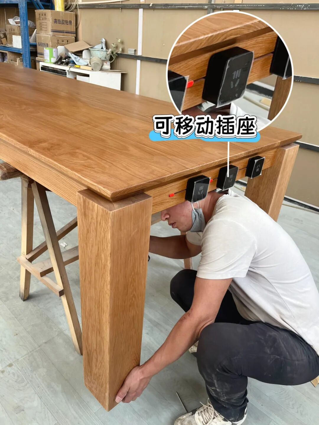 买桌子的时候还可以和卖家沟通好,给桌腿开孔,或者请木工帮忙给桌腿开槽,把电线从桌腿穿到桌面下,接通桌面插座。