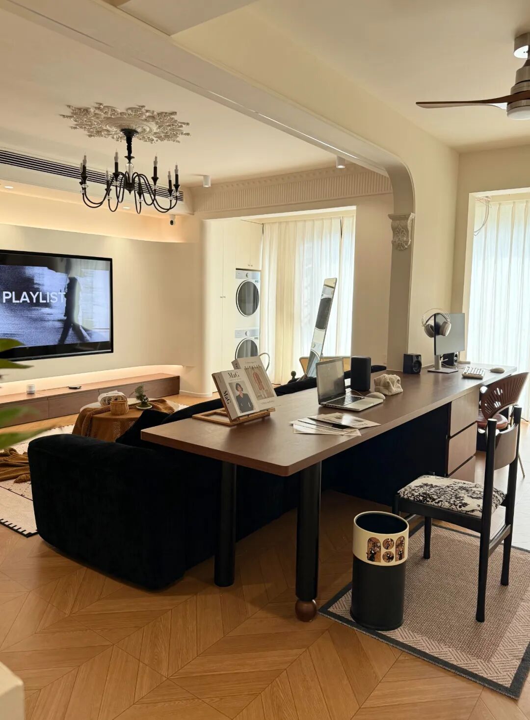 让全屋定制做了一张3.5米的超长书桌,整个大横厅变成了一半书房一半客厅,不得不说这个决定简直太对了,客厅秒变大,连通着大阳台,视野更开阔,光线也贼拉好,不仅仅好看,也很实用。