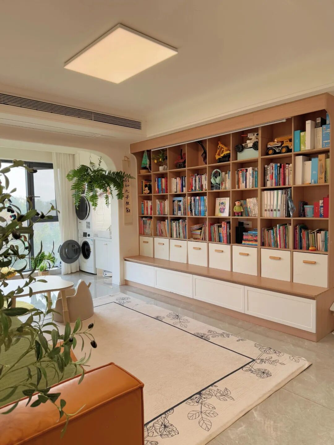 客厅书柜下方还做了一整排卡座,既能当座位坐,取高处书籍时可以踩上去很稳当,而且卡座还可以将日常杂七杂八的东西塞进去收纳。