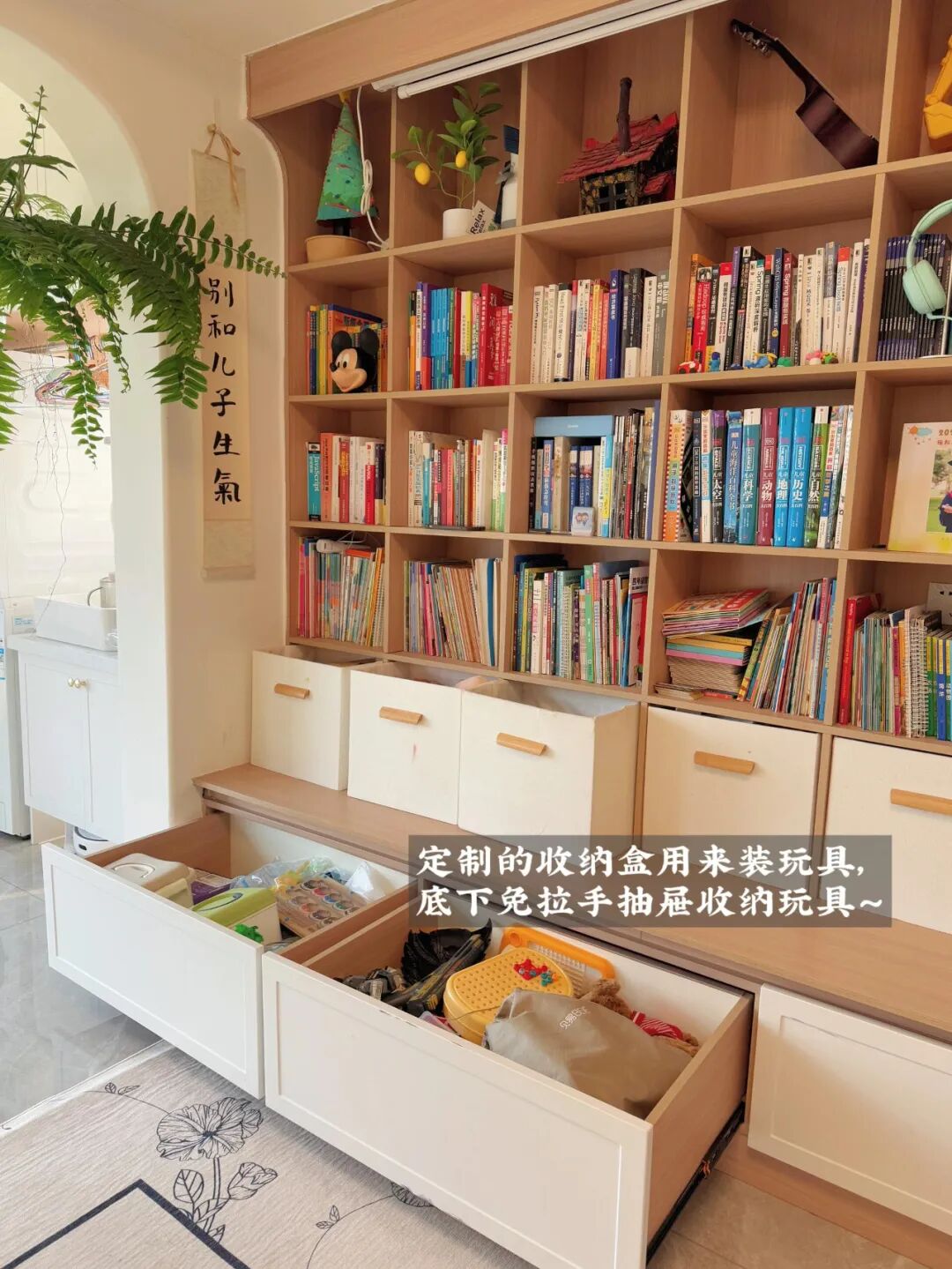 现在,整面墙定制了顶天立地的书架,层板厚度1.5cm,深度30cm,稳如老狗!书摆上去的那一刻,家里瞬间有种“文化人”的底气。