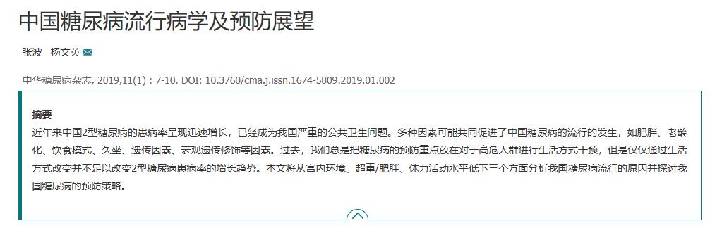 参考资料:[1]张波, 杨文英. 中国糖尿病流行病学及预防展望 [J] . 中华糖尿病杂志, 2019, 11(1) : 7-10.