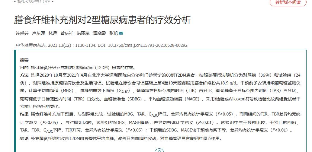 连晓芬, 卢东晖, 林远, 等. 膳食纤维补充剂对2型糖尿病患者的疗效分析 [J] . 中华糖尿病杂志, 2021, 13(12) : 1130-1134.