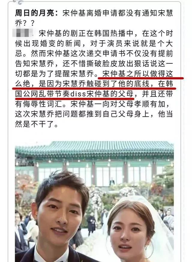 因为双宋没有公开离婚原因,加上媒体的捕风捉影,一会儿爆料宋慧乔是因为财阀包养被宋仲基抓到了,一会儿又爆料宋慧乔与宋仲基父母关系恶劣,又说宋慧乔怀孕私自墮胎引起宋仲基的不满。