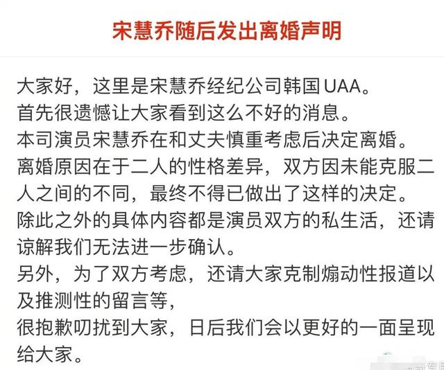 就在人们一头雾水之时,宋慧乔也通过公司发布了离婚声明,她写的原因是性格存在差异,双方未能克服。