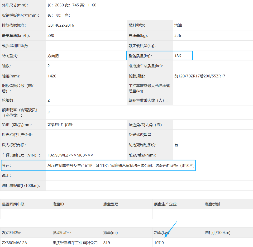 从申报的参数来看,由于手把的变化宽度来到805mm,而整车长度和轴距与820RR完全相同。前后17寸的轮毂后轮改为190mm胎宽,整备质量为188kg。从申报图中我们可以看到减震和卡钳分别由渝安、泰斯克提供,所以配置基本与820RR相同,这里小编就不做过多赘述了。