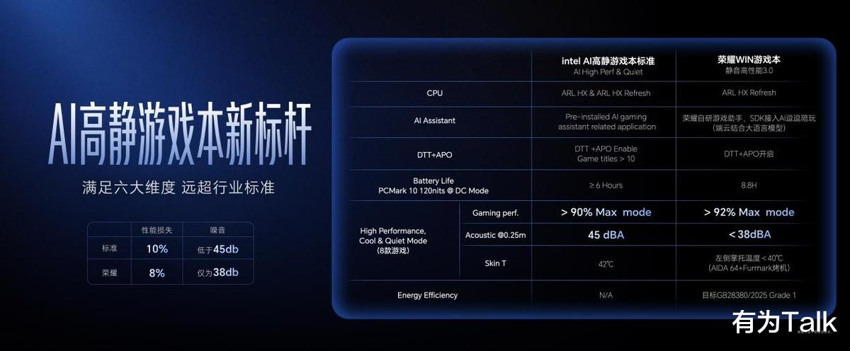 - 荣耀自研静音高性能模式3.0,畅玩3A大作噪音低于38dB,实现狂战性能与图书馆级静音的完美平衡,六大维度超越行业标准,真正做到“高能不吵人”。