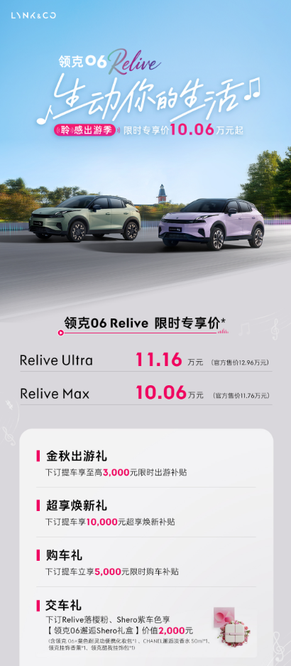 进入十月,汽车市场迎来 “金九银十” 销售旺季,众多汽车厂商推出优惠政策,消费者购车成本降低。在众多车型里,领克 06 Relive 凭借外观设计、配置表现及十月专属购车权益,成为年轻人购车的热门选择,其十月限时专享价仅 10.06 万起,进一步提升了产品吸引力。