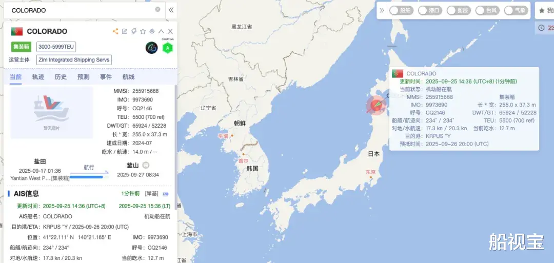 船视宝公开数据显示,“科罗拉多”号是一艘船长255米,宽37.3米,5500TEU,建成于2024年7月,挂葡萄牙旗的集装箱船。