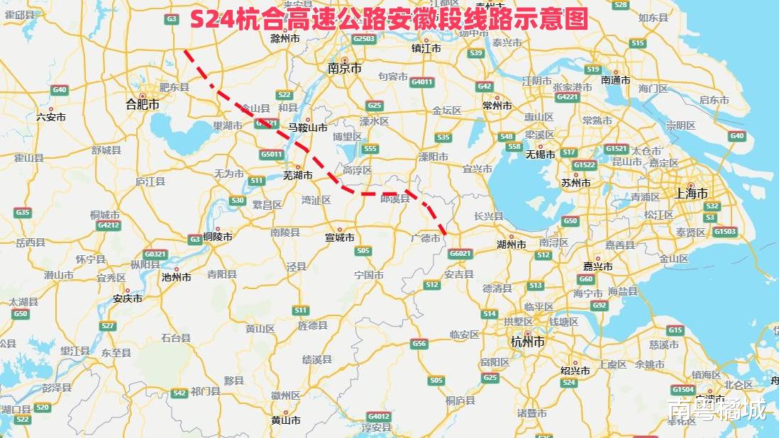 目前,安徽正在启动新一轮高速公路建设规划。在《安徽省国民经济和社会发展第十四个五年规划和2035年远景目标纲要》中明确提出,将加快贯通境内国家高速公路和重要省级高速公路,加密建设至周边省份的高速公路。在这样的背景下,作为加密皖浙省际通道的关键项目——S24杭州至合肥高速公路被定位为安徽高速公路网中54条联络线之首。根据规划,项目起于合肥东杨店枢纽,经含山、芜湖(泰山路长江大桥)、郎溪、广德,终于浙皖界安吉,全长约229公里,其中马鞍山段约65.5公里,双向六车道,设计速度120公里/小时,估算投资1416831万元,建设工期36个月。