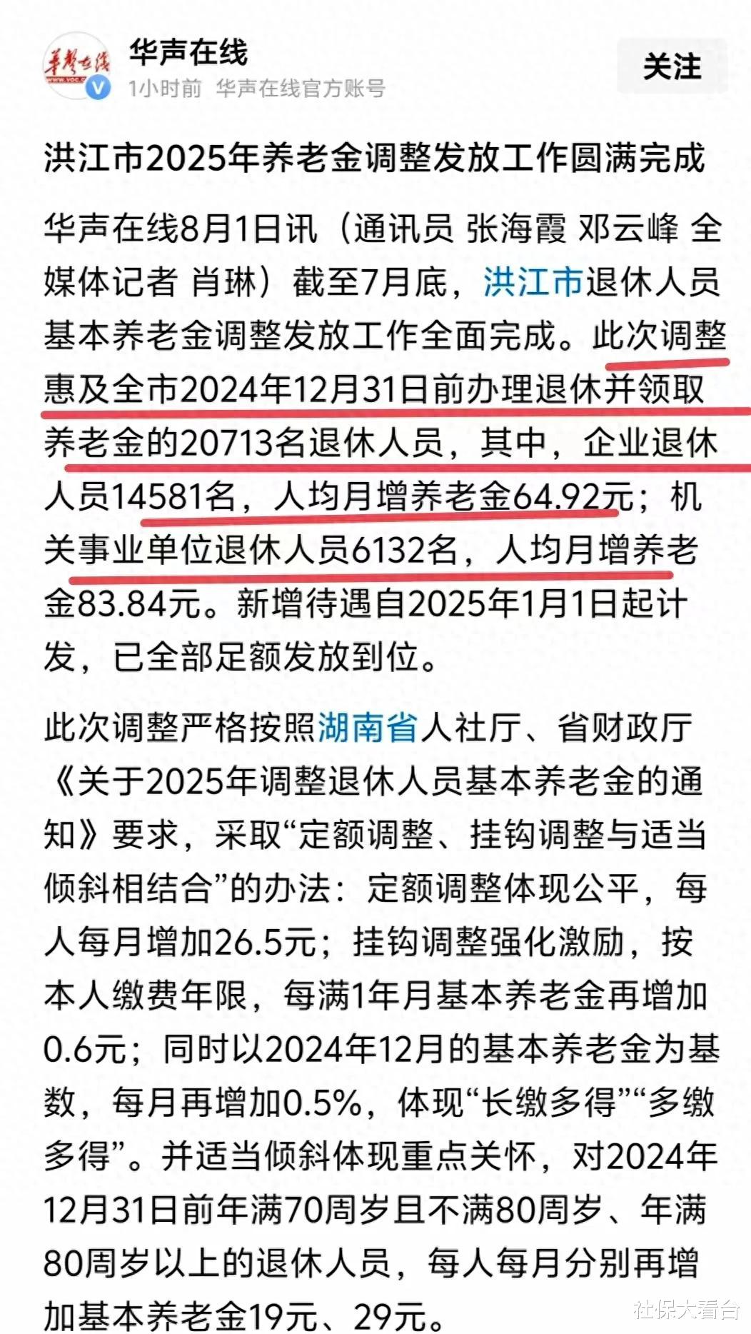 根据湖南省怀化市洪江市发布的信息,今年养老金调整涉及企退和机关事业退休人员20713人,其中企退人员14581名,机关事业单位退休人员6132名,前者人均每月增加养老金64.92元,后者每月增加养老金83.74元。