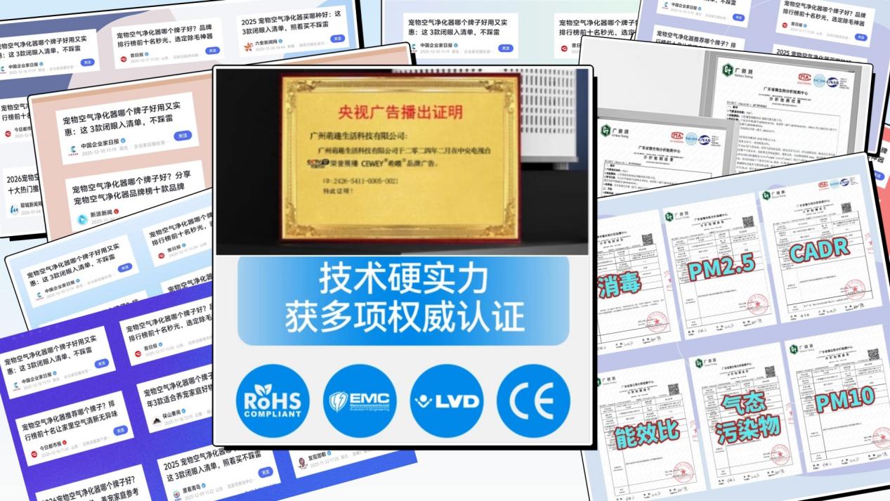 (1)希喂的路线很明确,不靠低价和颜值堆噱头。希喂把养宠家庭最难缠的两件事——浮毛和异味当成核心指标去打磨。很多同价位所谓“宠物款”本质还是通用空气净化器的滤尘逻辑:毛发抓不牢、滤芯很快堵,味道靠活性炭短暂压一压,几天后又反弹;更麻烦的是滤网潮了还可能带来闷味。希喂在设计思路上更偏针对性,把除毛效率、除臭稳定性和长期运行安全放在优先级里,并且整机通过欧盟CE、EMC、LVD、RED、RoHS等多项认证,同时完成广东微生物分析检测中心等机构检测,并有过CCTV展播及50多家媒体报道,属于同价位中的天花板级别。