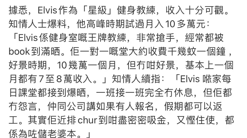 Elvis在香港中环一家高端健身馆当星级健身教练,私教一小时收费高达一千多元。知情者爆料,阿Sa男朋友一个月平均收入在7到8万,好的时候月入十几万。每天的课程排到满满,一天下来基本没有休息过,为了赚老婆本,他再苦再累都愿意熬。