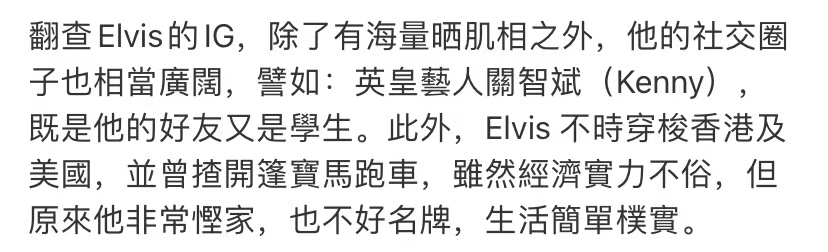 Elvis的社交圈也非常广阔,在他的IG里看到关智斌也是他的学生兼好友。关智斌是阿Sa二十几年的好朋友了,从他们的关系看Elvis有很大几率能和阿Sa走到最后。他虽然节约,但是经济实力不俗,有自己的跑车,也经常飞美国,这样的男人在消费观这坚持实朴为主,跟阿Sa三观很贴切。