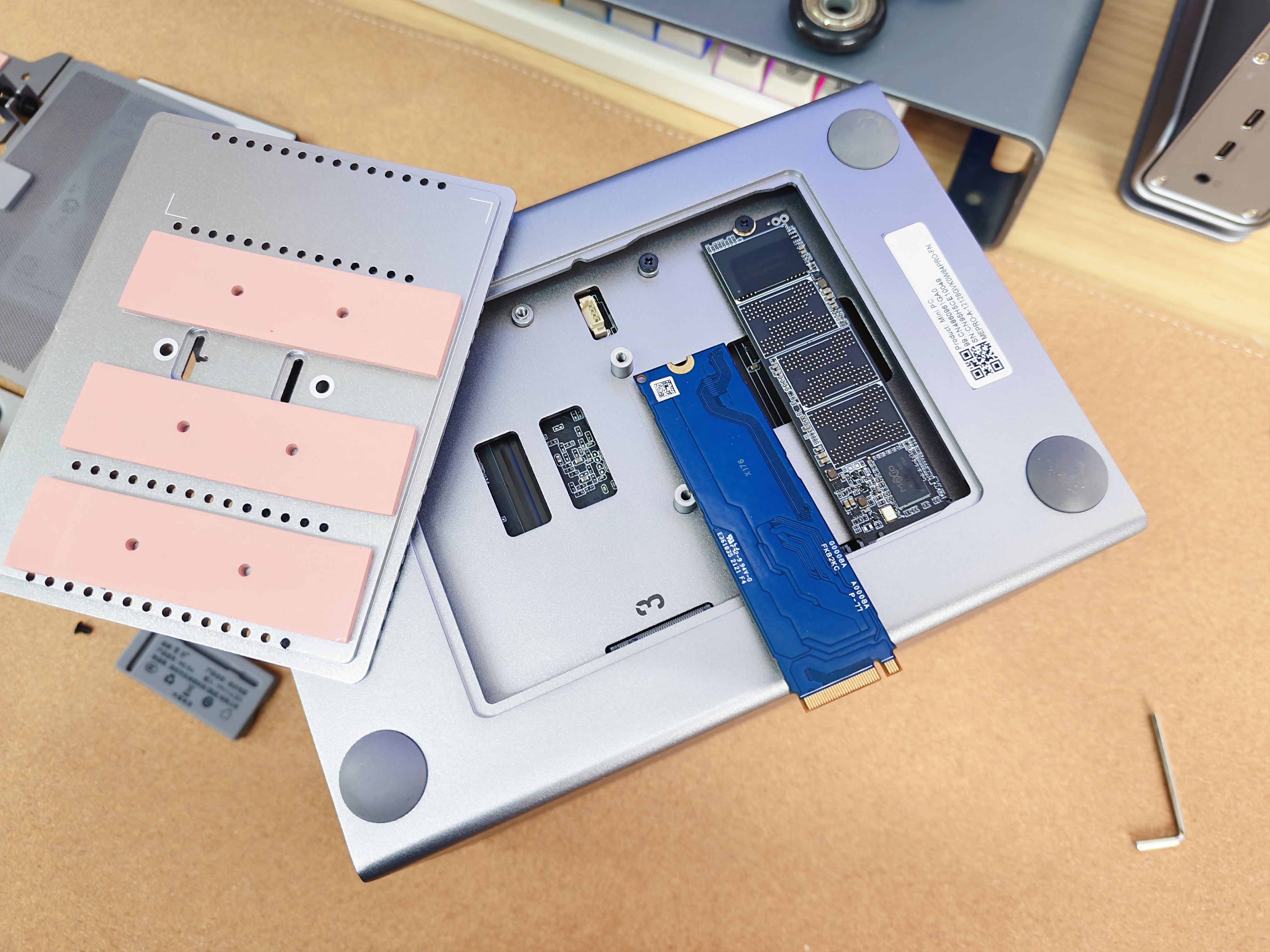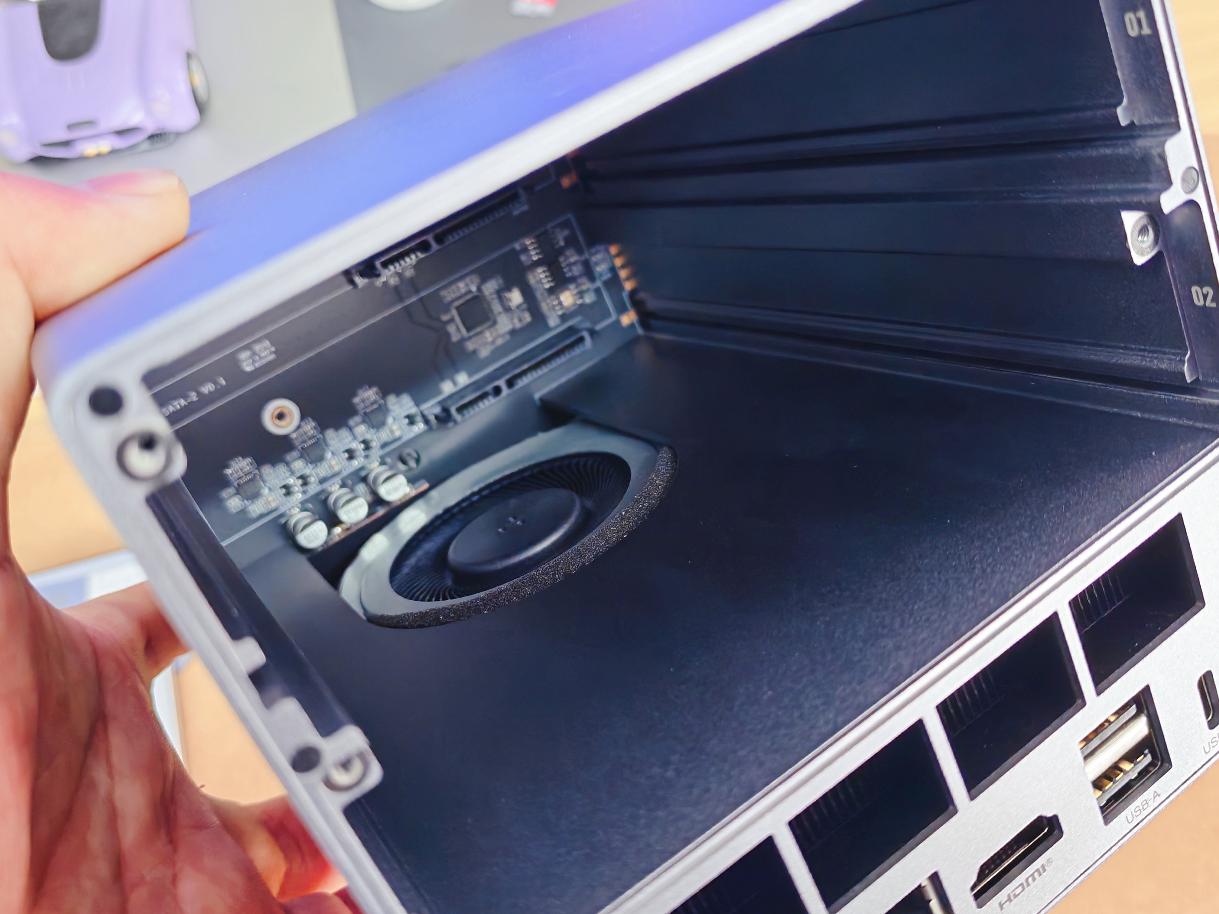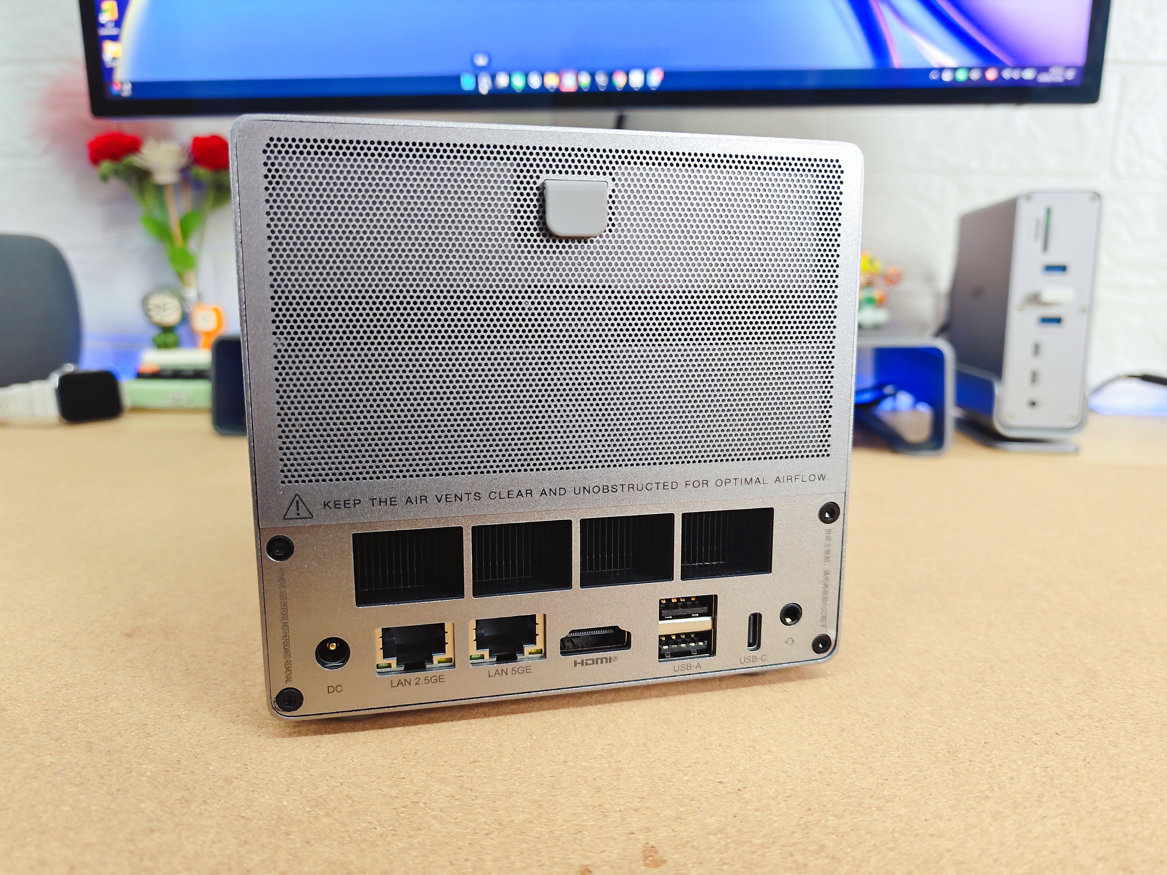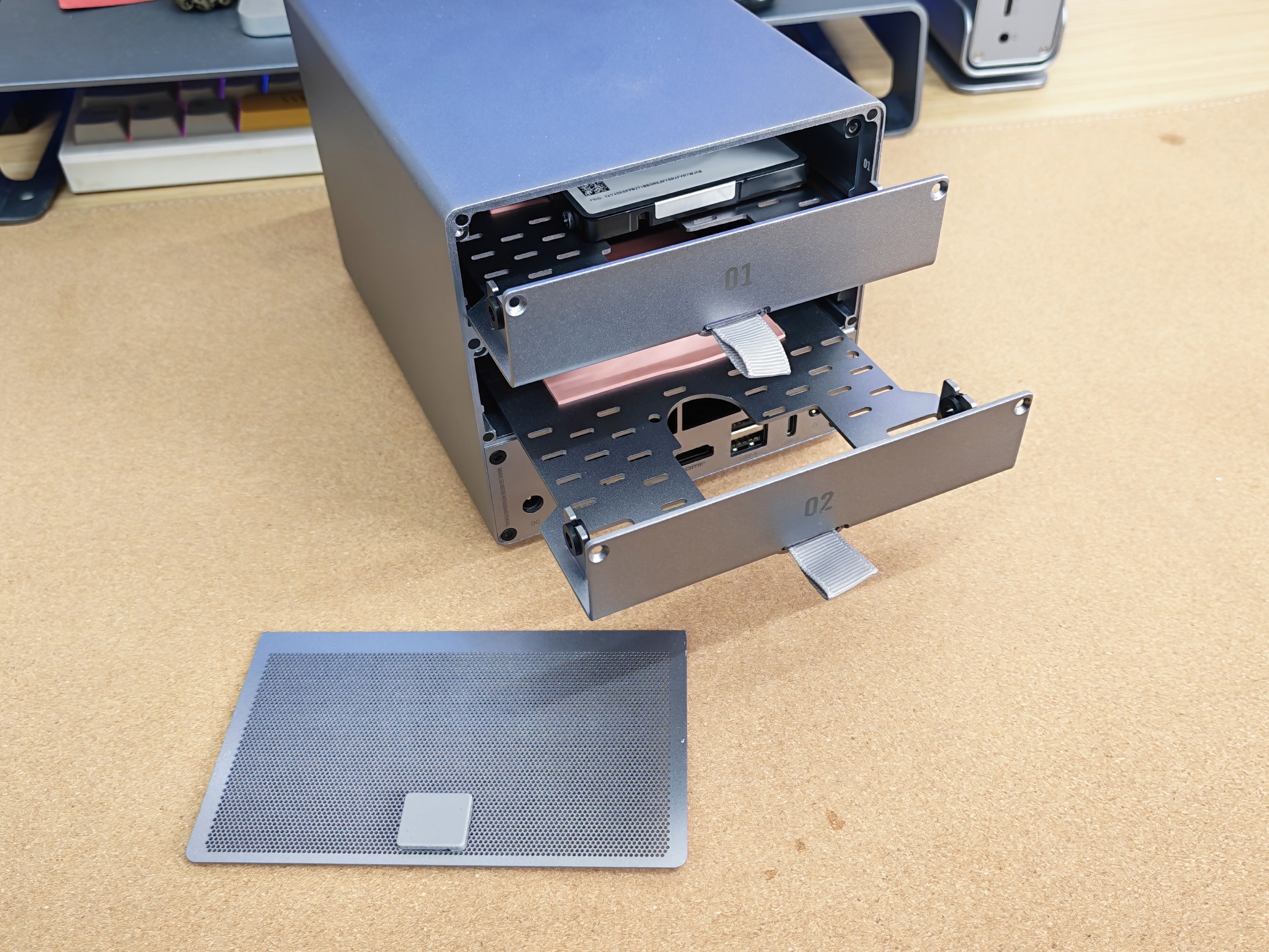 但最大的震撼,来自于一个看似简单的数字:5盘位。在如此迷你的身躯里,如何容纳两个3.5英寸的机械硬盘和三个M.2 SSD?