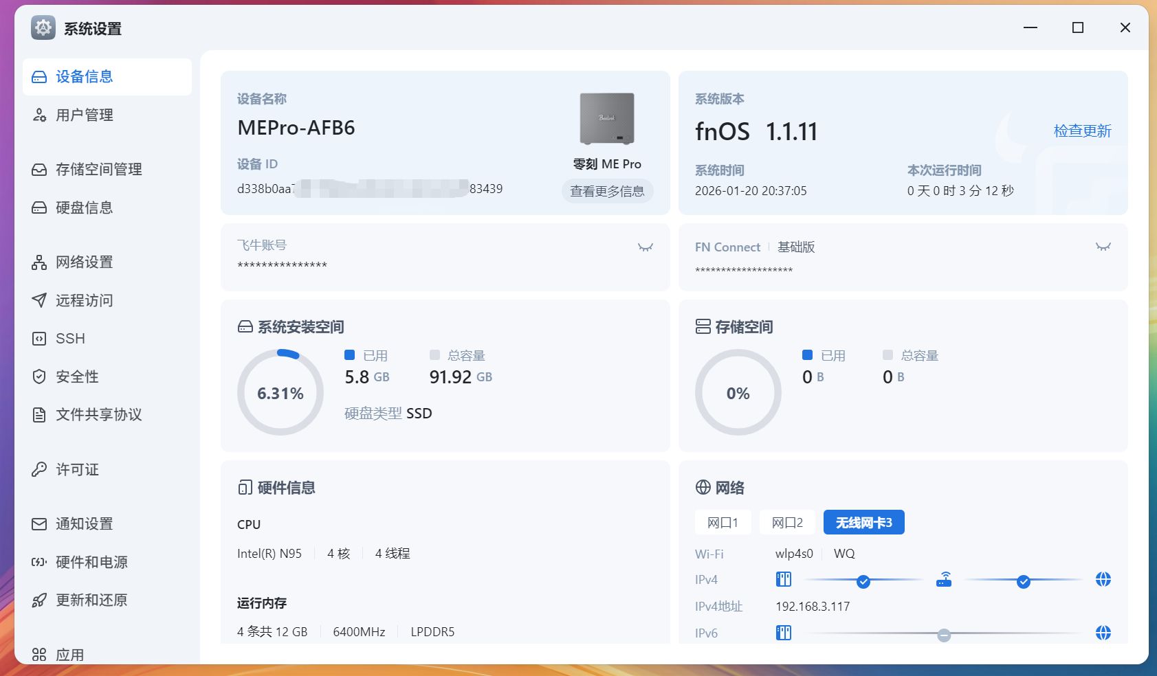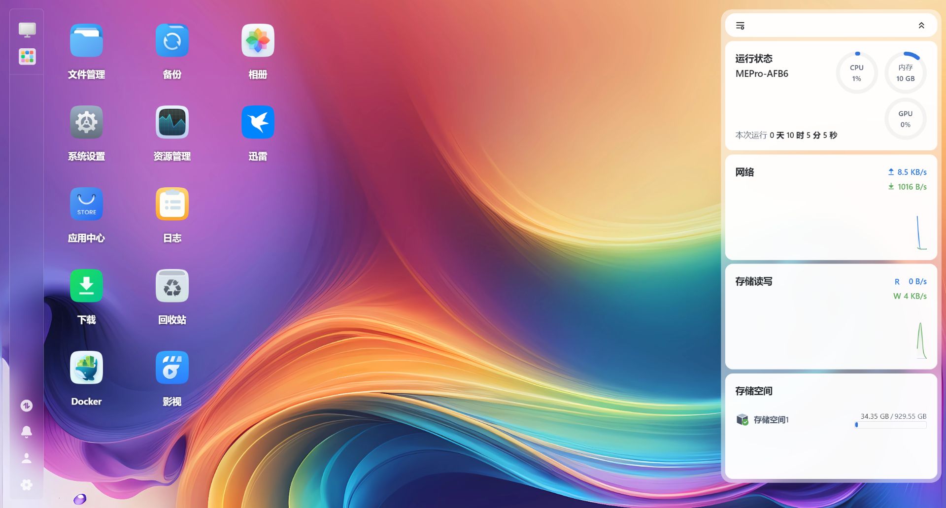 通电开机,预装的飞牛OS系统的初始化过程极其友好,图形化引导,十分钟内即可完成基本设置。系统界面清新直观,功能模块清晰,对于从主流系统转来的用户几乎没有学习成本。