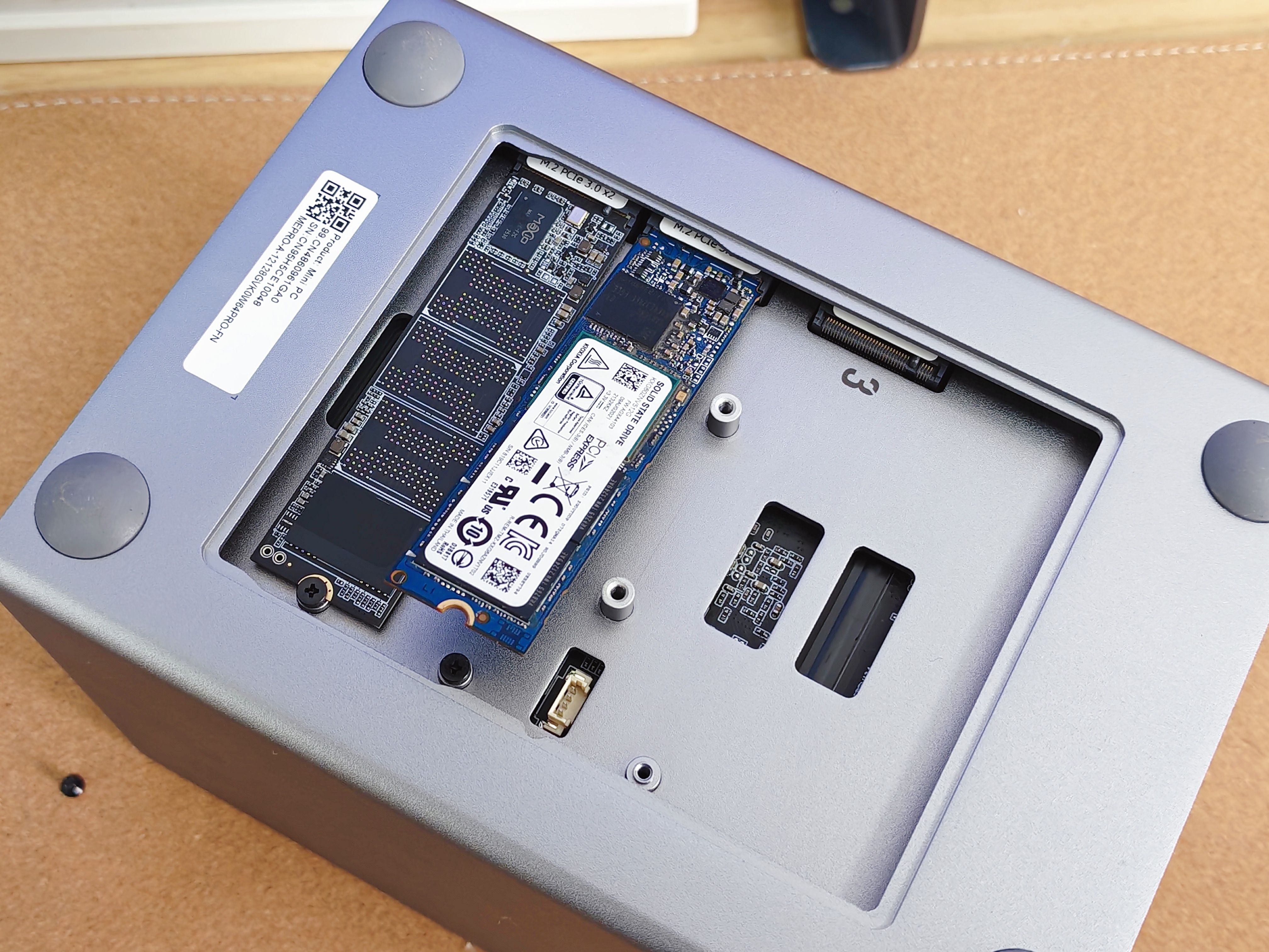 抽出硬盘笼,底部盖板下,是三个M.2 SSD插槽(PCIe 3.0规格)。