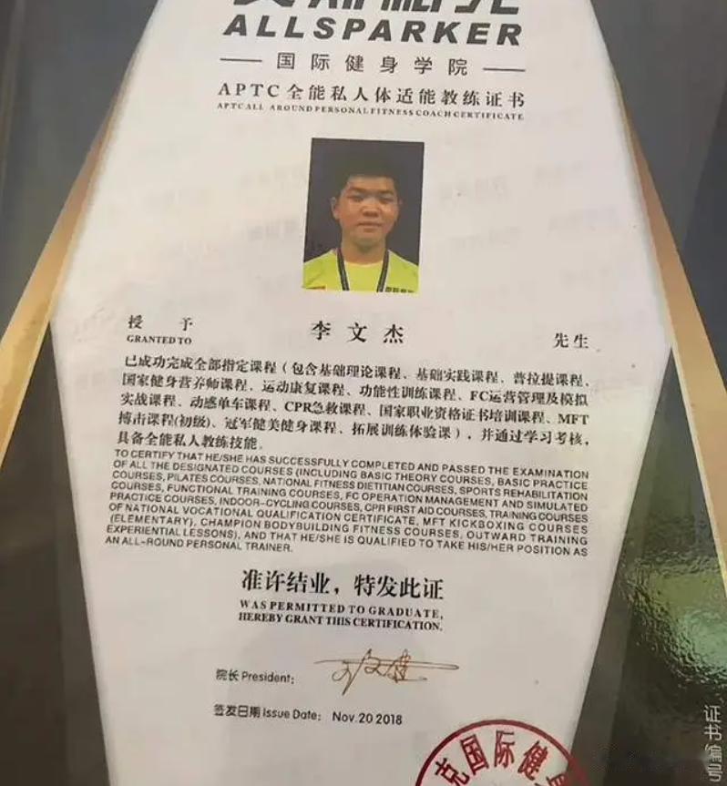 据了解,李文杰出身于一个普通的四口之家,因为母亲身体不好,家里经济条件一直不算宽裕。为了帮衬家里,李文杰早早辍学,成了一名修理工,起早贪黑地干活,只为给家里多挣点钱。后来一次偶然的机会,他接触到了健身,从此便深深沉迷。在他刻苦努力下,他练出了健硕的身材,还成功考取了私人教练证,成了当地小有名气的健身教练,生活也渐渐变好。