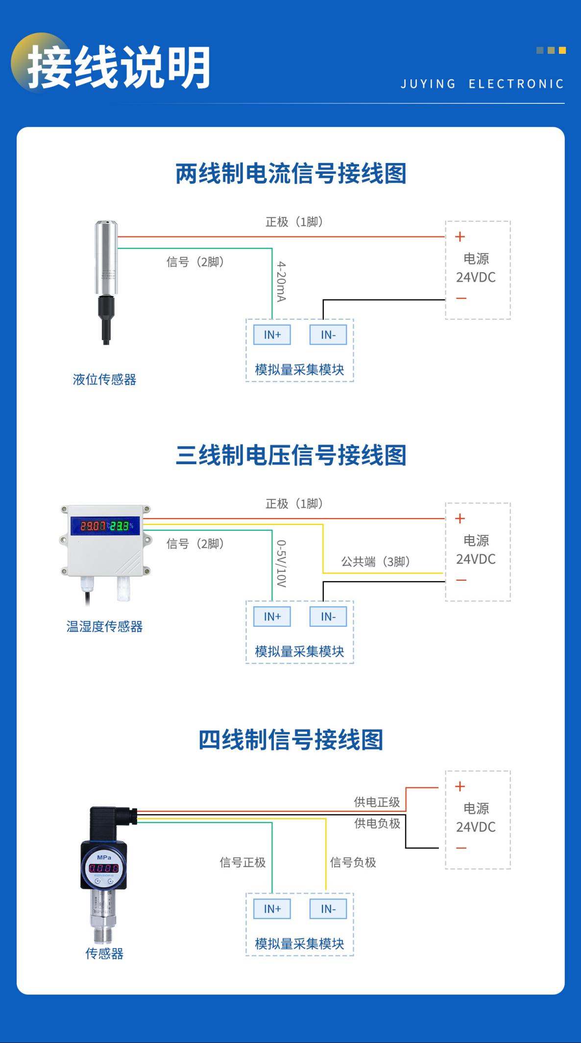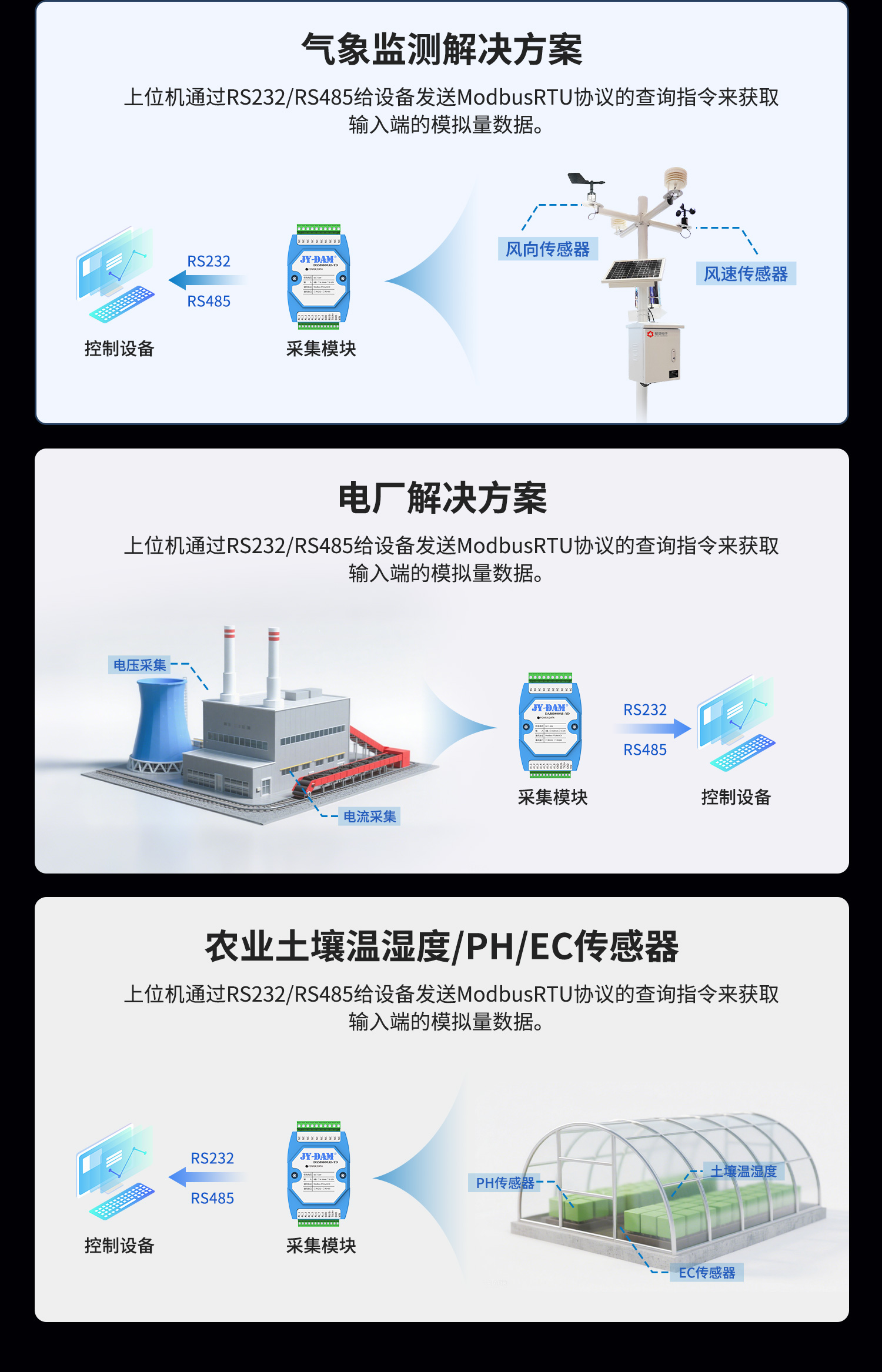 * 光伏发电:用于追踪最大功率点(MPPT),监测汇流箱和逆变器的直流侧电压/电流、交流侧电压/频率、以及组件背板温度等,提升发电效率。