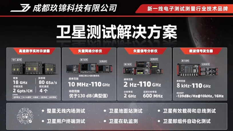 会议现场,玖锦科技的卫星测试解决方案成为全场焦点。对卫星产业链而言,卫星芯片与器件、部组件与单机、整机与子系统、系统与整星的设计、定型、制造、验证、总装、发射、在轨等环节都离不开各种测试场景,对于这些场景而言,“射频三大件”与示波器是构成强大测试系统的基础。通过技术讲解与产品演示,向与会者展示了玖锦科技在卫星互联网领域的创新能力和技术优势。此外,玖锦科技卫星测试系统全面覆盖卫星发射、卫星运营、卫星应用仿真等多个环节,通过不断的技术创新和优化升级,致力于为卫星领域提供更加优质、全面、高效的测试解决方案,推动航天事业的高质量发展。