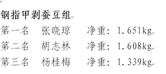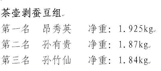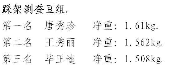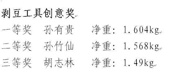 经过激烈比拼,5个组别前三甲脱颖而出,其中创意工具组(茶壶)孙有贵以15分钟剥豆1.604Kg的好成绩拔得头筹。