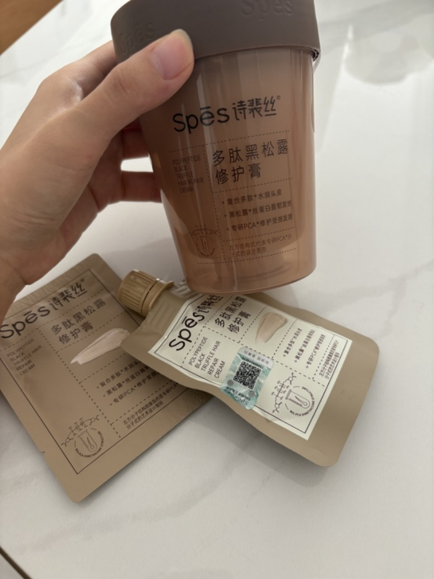 它的配方还行,染烫后用着能顺点发丝,但没想象中惊艳。主打的渗透设计挺巧,敷时能感觉到精华往头发里钻,不过洗完发尾还是干,可能天然成分少。我头发偏油,用后半天就油,这点烦,不适合我。