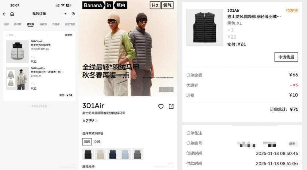 这些商品也确实便宜。据消费者们晒出的订单,他们花22元下单成功的轻薄羽绒马甲、拼色羽绒马甲和羽绒冲锋衣,其真实价格分别为299元、503.1元和739.1元,对比消费者的“低价”差值高达数十倍。