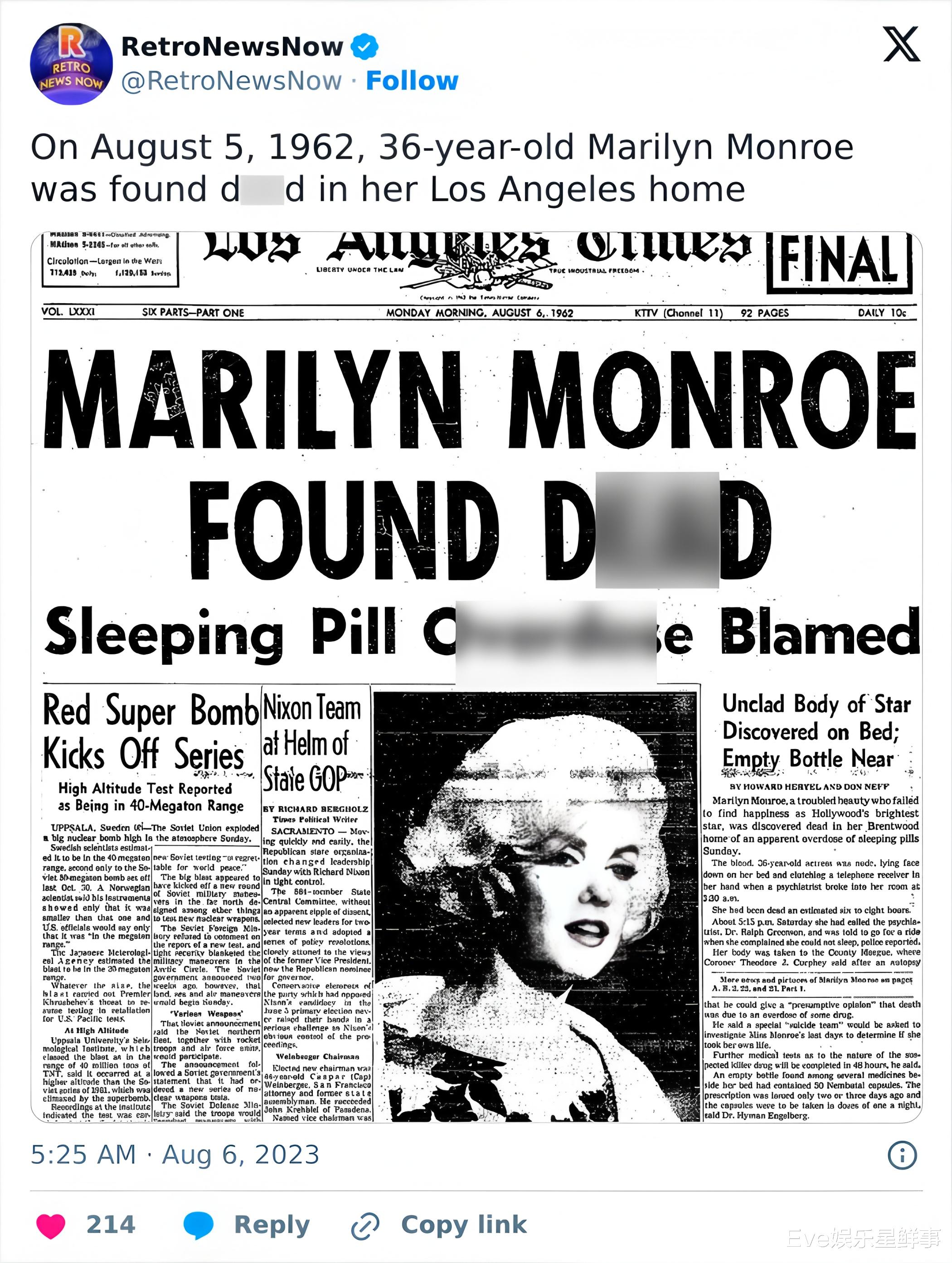 据一位退休侦探的调查,隐藏的纸质文件、监控记录及一份认罪书,可能指向这位女神更为黑暗的结局。1962年8月5日凌晨,梦露被发现躺在家中的床上,年仅36岁。