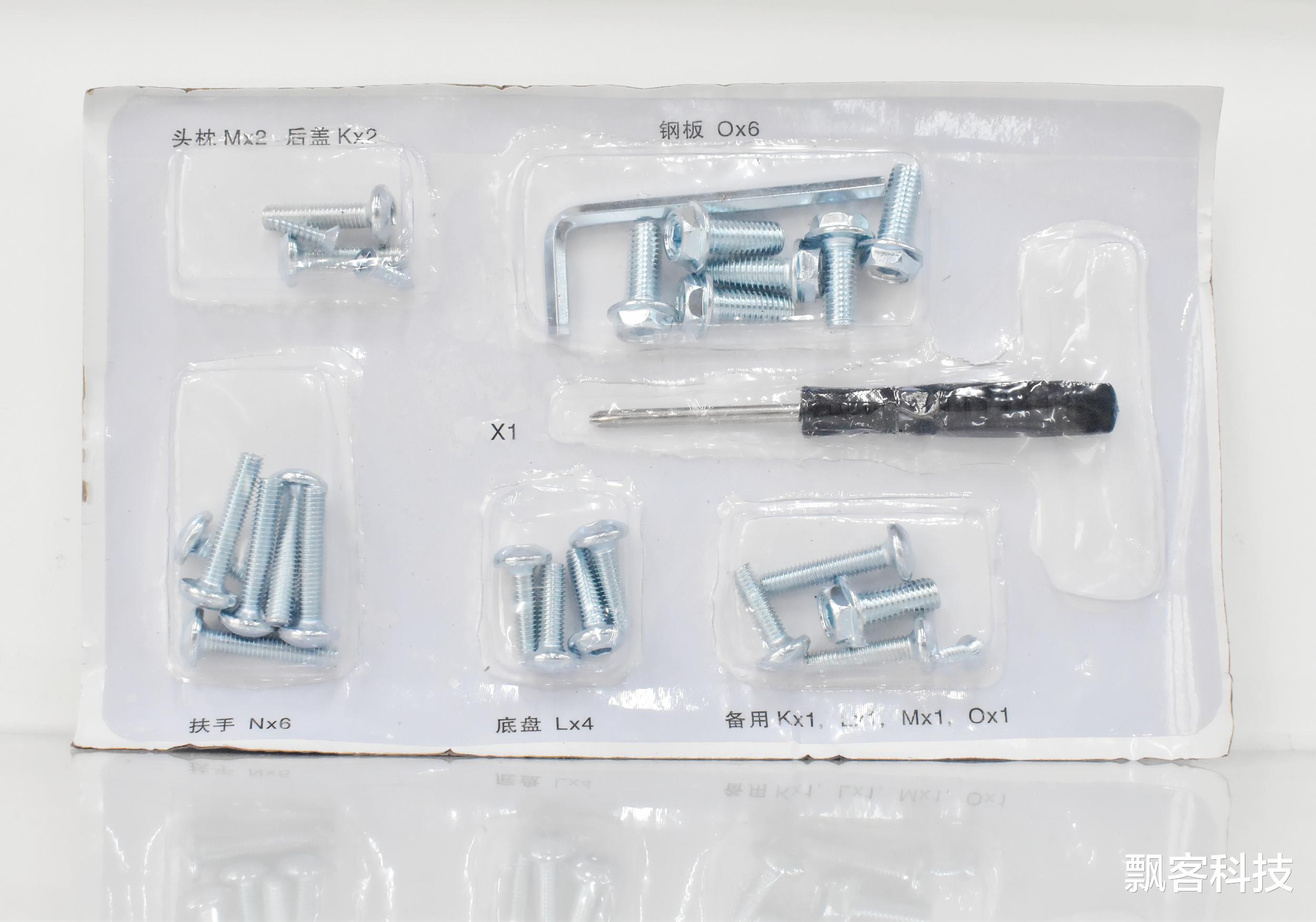 打开箱子后将里面的部件摆放在一起展示一下,这些配件一目了然,包括椅身、椅脚、坐垫、靠背、钢板、脚轮、头枕、椅背装饰盖等,另外还有螺丝、工具和说明书。椅子这些配件需要自行安装,不过都很简单,对照这已分类的螺丝按说明书就能轻松搞定。