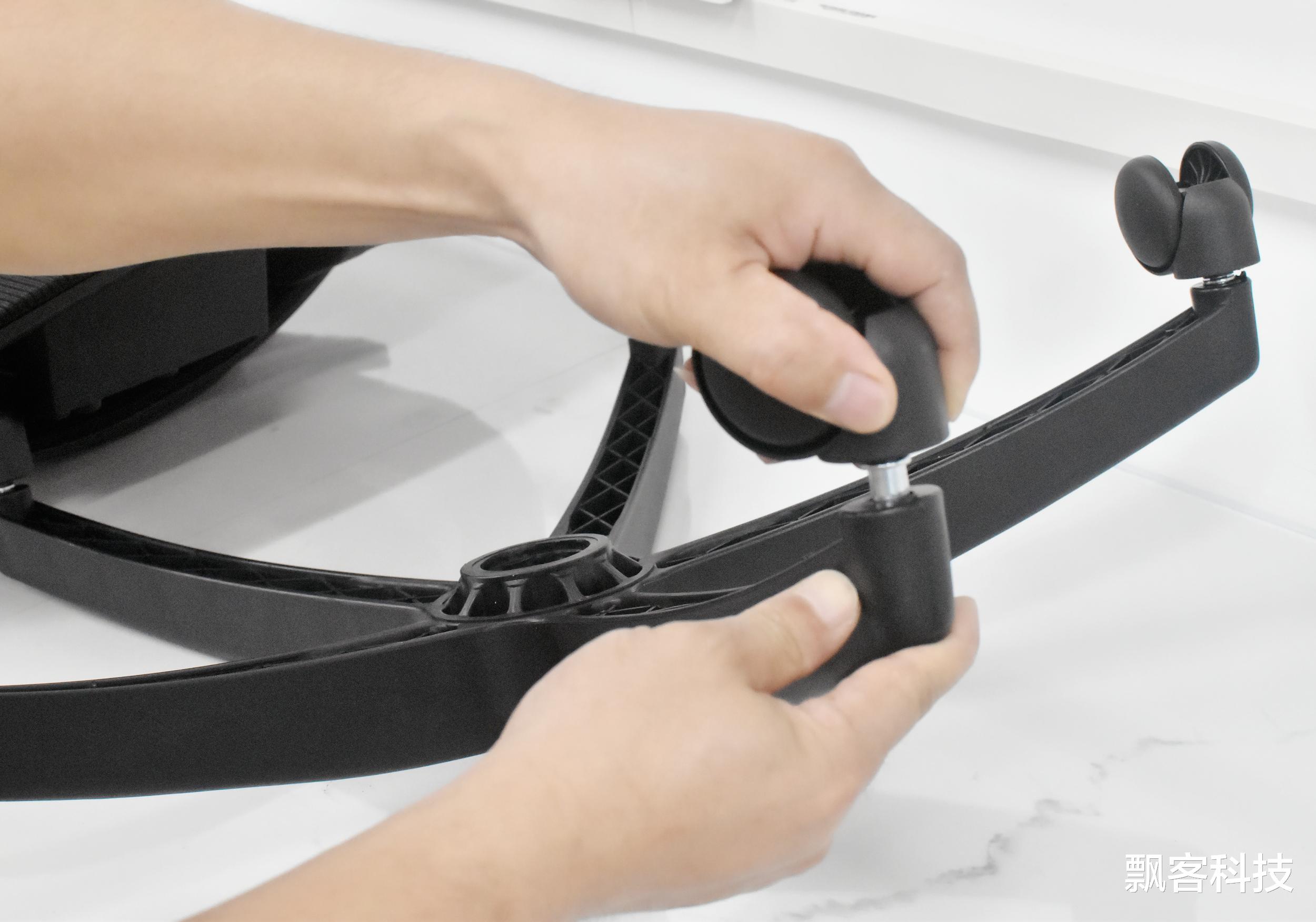 安装的过程真的比想象的还要简单,首先将五星椅脚和轮子安装好,万向轮的安装非常顺滑,将带有卡簧的铁柱按入对应的孔中即可。