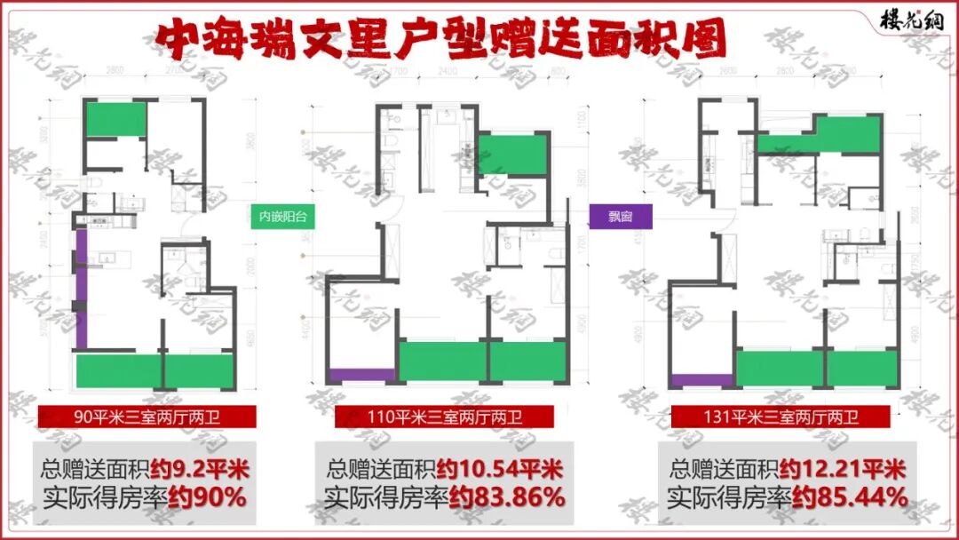1、两者南向三面宽,客厅及主卧都有南向内嵌式阳台、会封闭,南向一个次卧送了飘窗。在面宽上,中海瑞文里多了30厘米,意味着赠送稍微多了点;