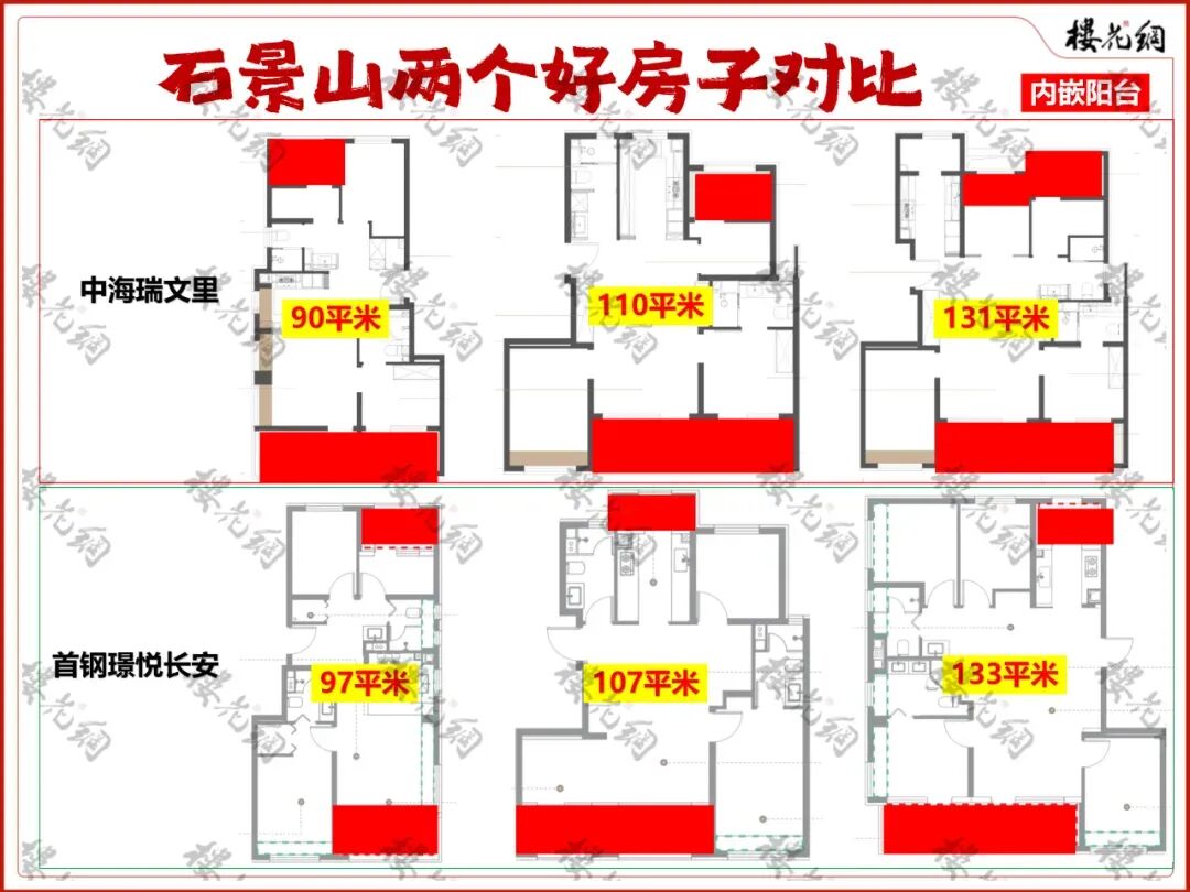 2、北向都是内嵌式阳台,中海瑞文里北面两个房间都有阳台,而首钢璟悦长安只在厨房设计了一个进深1.7米阳台,一个卧室送了侧面飘窗。