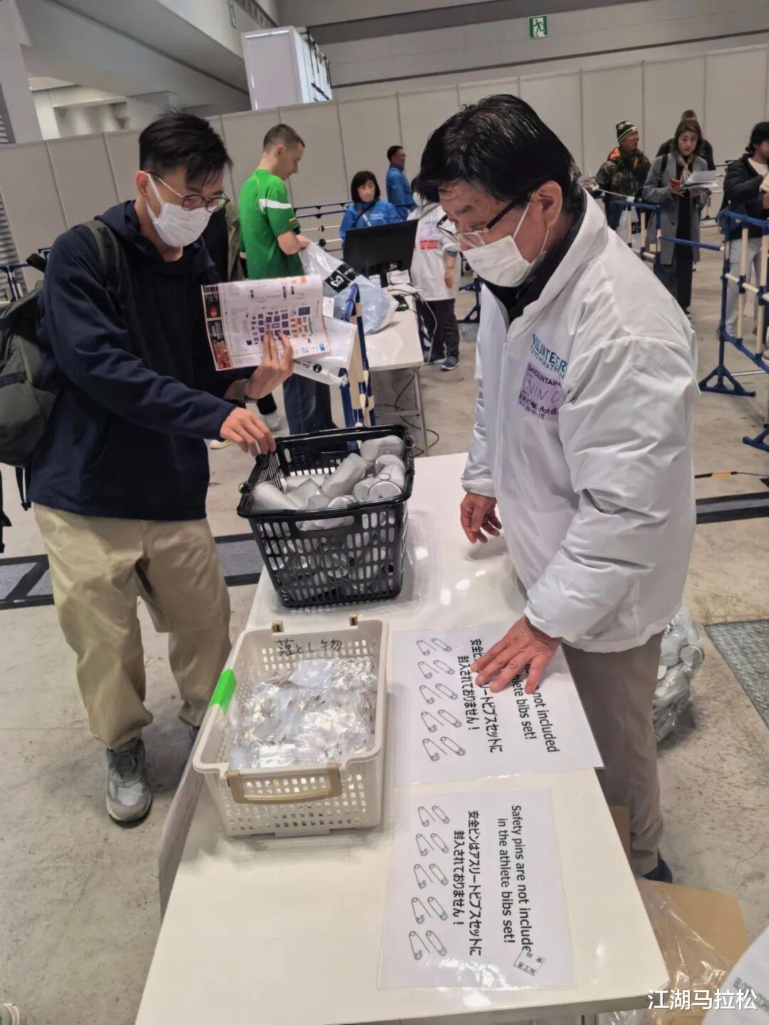 对于东京马来说,就没有参赛包一说了。你报名时缴费购买了服装等,可以到专门的柜台取领取。接下来验芯片,过了后有软杯子、别针可以自取,就这些了。