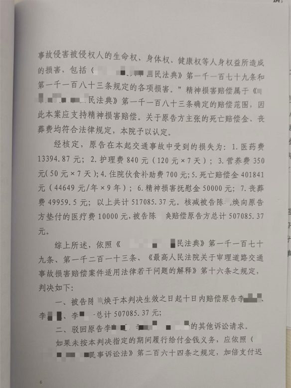 2026年2月9日,李尚千妻子、女儿、儿子提起民事诉讼。2026年3月12日,山阴县法院作出民事判决,核定医疗费、护理费、死亡赔偿金、丧葬费、精神损害抚慰金等各项损失共计517085.37元,扣除已垫付的10000元医疗费,判令陈某焕赔偿三原告共计507085.37元。