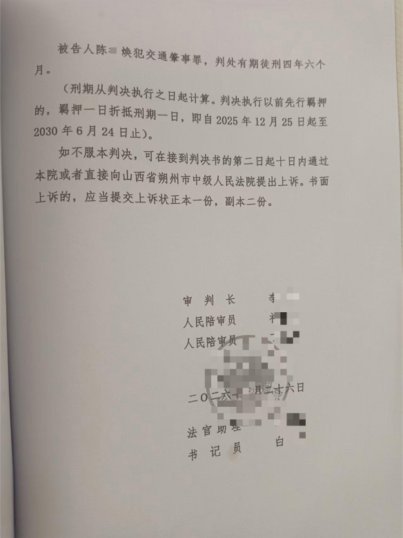 2026年3月26日,山阴县法院作出刑事判决,陈某焕因交通肇事罪,被判处有期徒刑四年六个月,目前仍羁押于山阴县看守所,尚未移交监狱服刑。