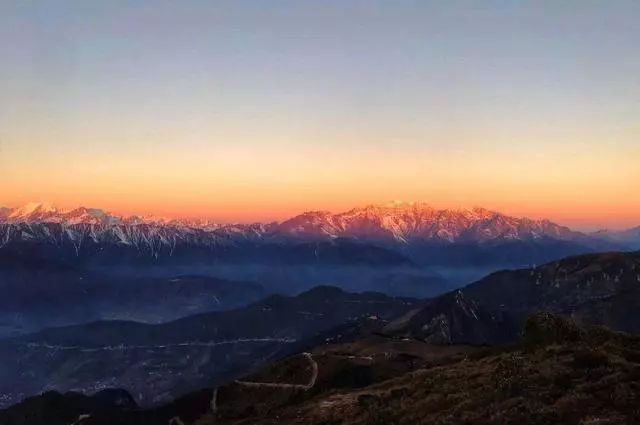 到了冬天,华尖山的日出时间在七点半左右。如果你想看日出,那么得爬到山顶上。山顶距我住的地方爬山10来分钟,比较近。没有云海的华尖山日出比较一般,但在另一面,当阳光升起来的时候,金色的阳光照耀在贡嘎山和田海子山上,十分神圣。