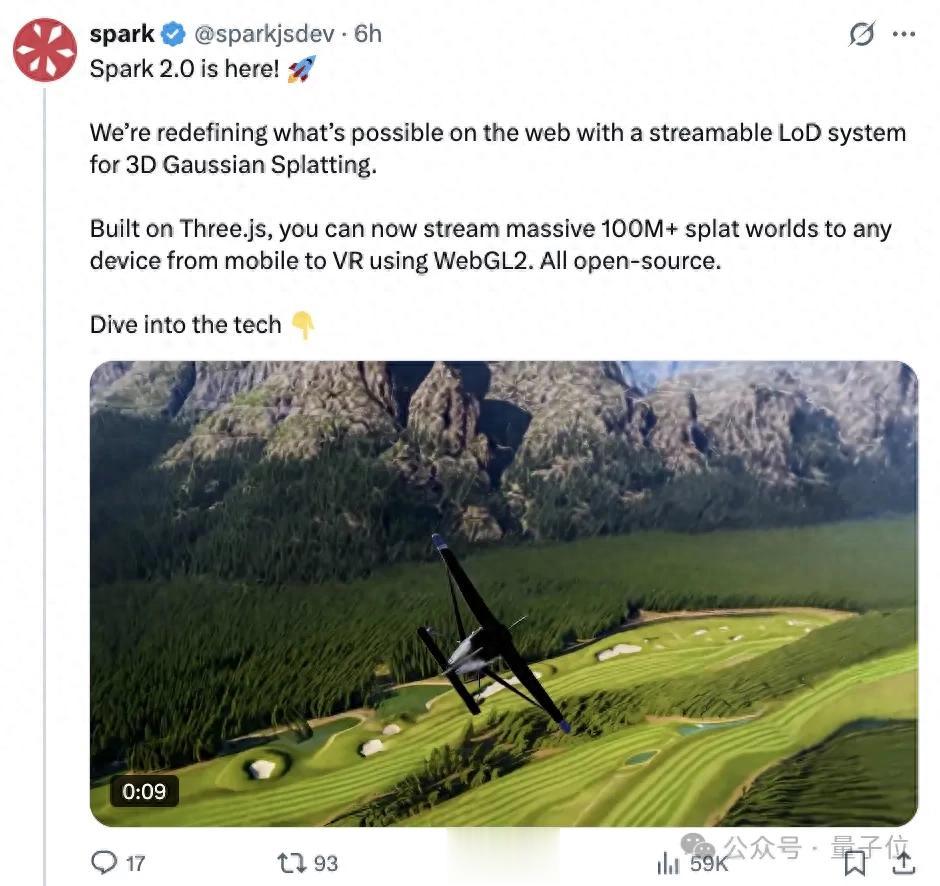 Spark 2.0基于Three.js构建,用户可以通过WebGL2,将包含1亿+splats(3D高斯点/泼溅点)的超大规模3D世界,流式传输到任意设备上,包括桌面、iOS、Android、VR。