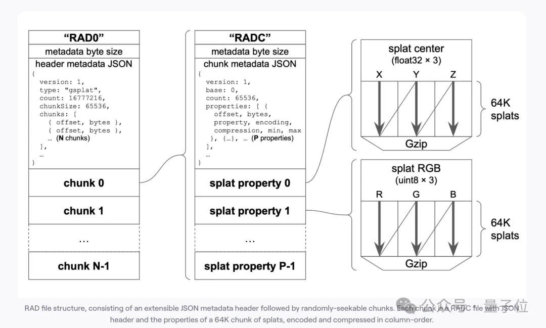 Progressive StreamingSpark 2.0定义了一种全新的文件格式——.RAD(全称Radiance Fields,辐射场)。该格式不仅能有效压缩3D高斯溅射数据,还支持随机访问流式加载,实现了场景的渐进式精细化渲染,完美适配网络传输场景。