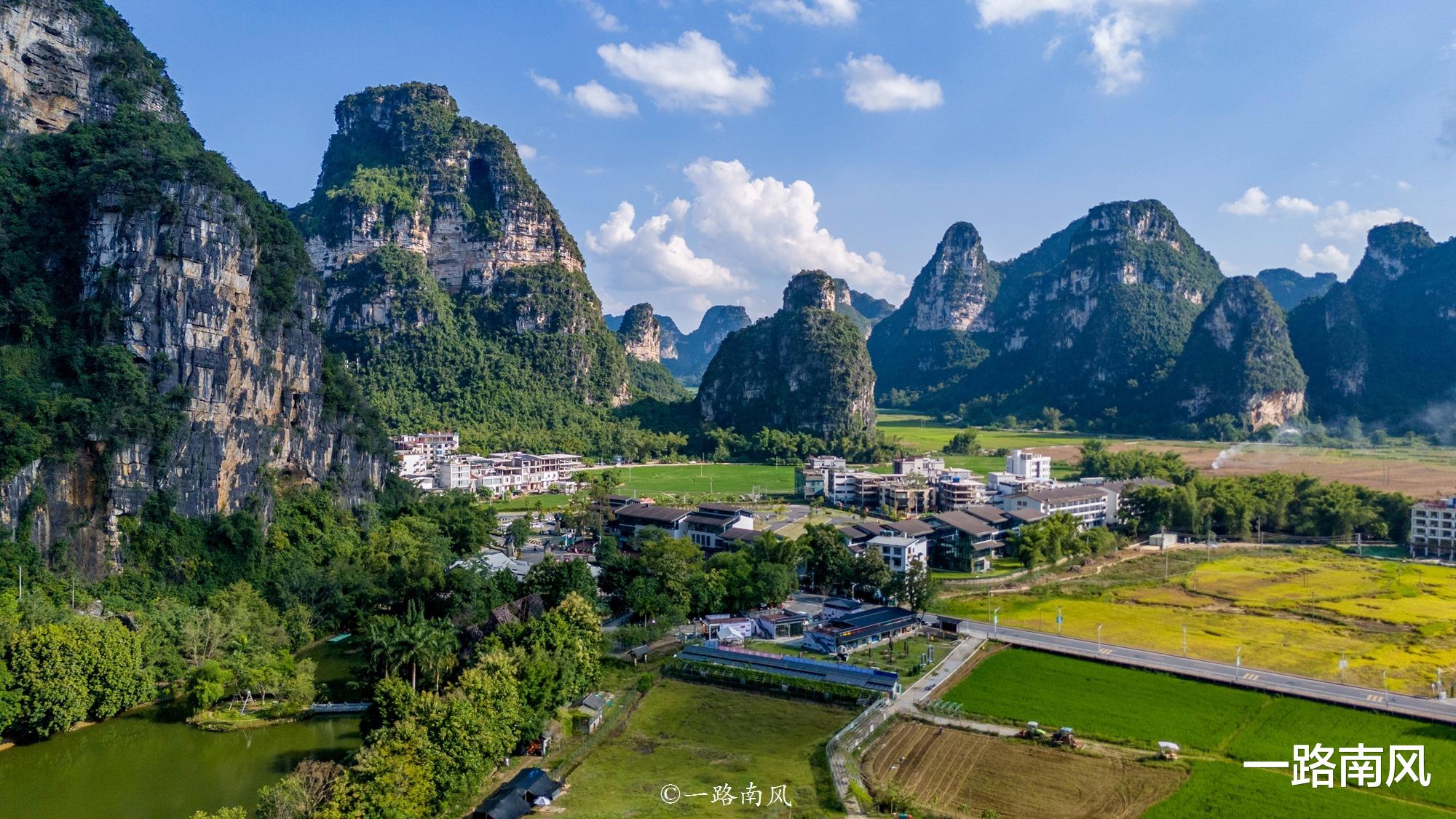 这里,是自然与田园交织的立体诗画。 数十座清秀的喀斯特峰林,不是孤傲地耸立,而是温柔地倒映在蜿蜒的明仕河中。河水碧如翡翠,平静时是一面收纳天光云影的镜子,竹筏划过,才泛起粼粼波光,惊不醒岸边安然的水牛。骑行在田野间的绿道上,目光所及是无边稻浪与错落的甘蔗田,壮族民居的翘角飞檐点缀其间,炊烟袅袅时,你会真切地感受到何为“山水相依,人在画中”。