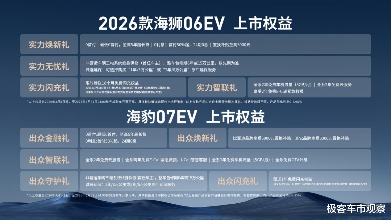 3月5日,比亚迪正式发布第二代刀片电池及闪充技术,向全球展示了其在新能源领域的又一里程碑式跨越。海洋网旗下搭载第二代刀片电池与全新闪充技术的三款重磅车型——2026款海狮06EV与海豹07EV正式宣布上市、海豹08全球惊艳首秀。其中,2026款海狮06EV官方指导价为15.99万元-17.99万元,并推出实力焕新礼、实力无忧礼、实力闪充礼、实力智联礼多重购车礼遇;海豹07EV官方指导价为16.99万元-18.99万元,即日起,用户可享出众金融礼、出众焕新礼、出众智联礼、出众守护礼、出众闪充礼多项购车礼遇。