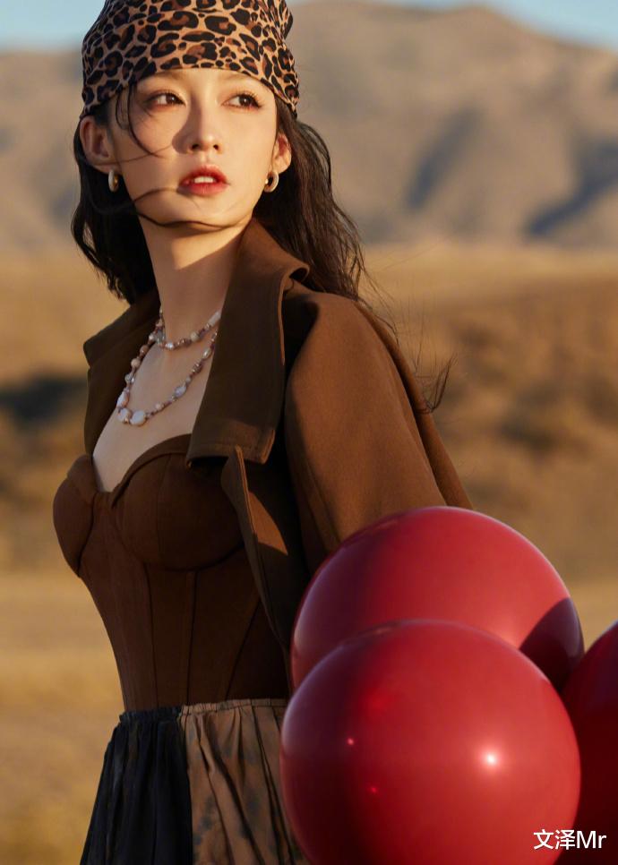 最富动态感的一张!李沁单腿站立高举气球的姿态,将牛仔靴的精致花纹与短裙的俏皮感完美展现。豹纹头巾随风飘扬,整个画面仿佛定格了她与荒漠共舞的瞬间。这不仅是时尚大片,更像她演员生涯的隐喻——始终保持着对表演的敬畏与热爱,在每一个角色中自由起舞。
