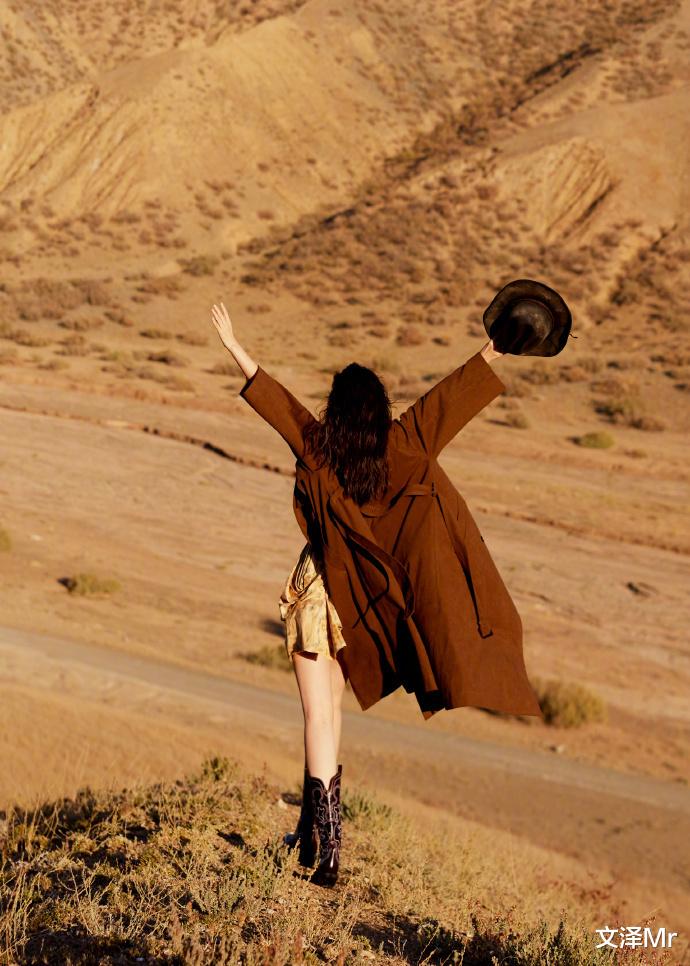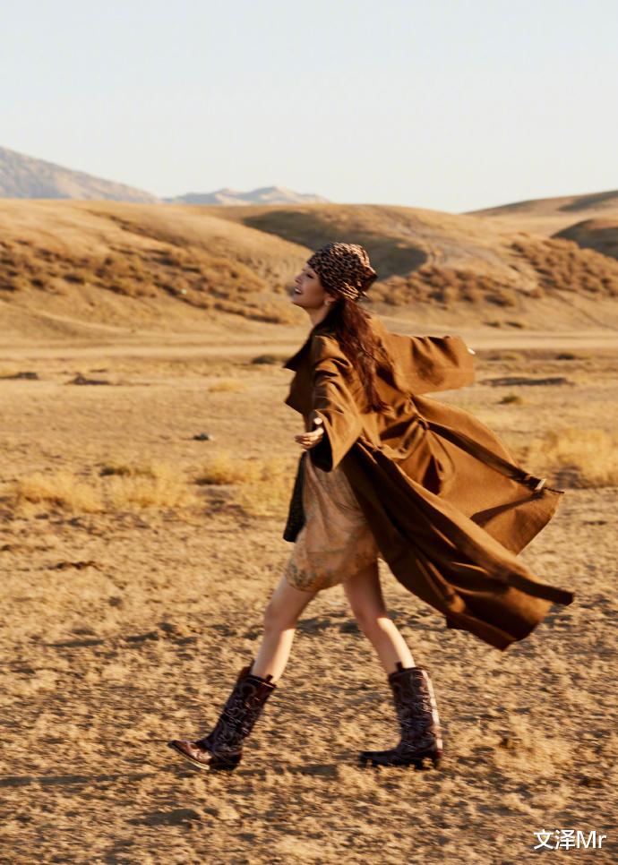广袤的荒漠中,李沁身着棕色长款大衣迎风而立。大衣的质感面料与腰间随性系带设计,与内搭的浅色碎花裙形成巧妙碰撞。她侧首回眸的瞬间,发丝轻扬,深色牛仔靴上的刺绣图案为整体造型增添复古韵味。这组造型将都市时尚感与荒漠的苍凉完美融合,展现了她对多层次穿搭的精准把控。