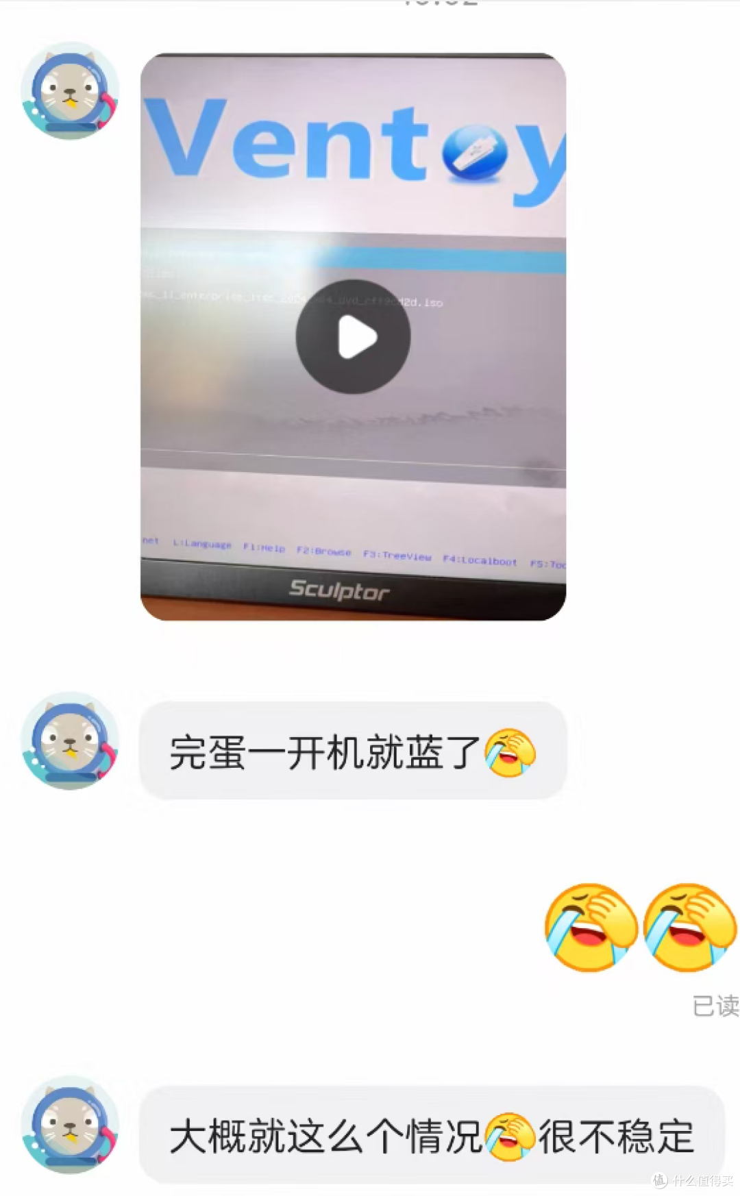 那么接下来的事情是这样的,昨天有点晚就睡觉了,然后大哥早上发了个测试视频,就是进pe系统,然后蓝屏了,大哥也是讲究人,也没重拍剪辑啥的,就直接说开机蓝屏了。