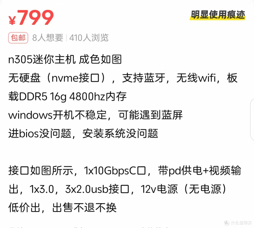 根据卖家大哥描述N305迷你主机,无硬盘,支持蓝牙和无线wifi应该是带着无线网卡,板载DDR5 16G内存,但是开机不稳定,会蓝屏,进bios和安装系统没问题。